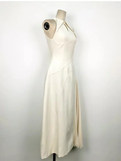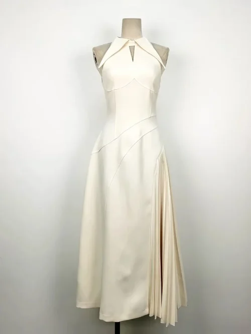 2024 New Arrival High-End Asymmetrical Pleat Dress Pointy Collar Big Swing Sleeveless Design Woven Solid Pattern Ruffles