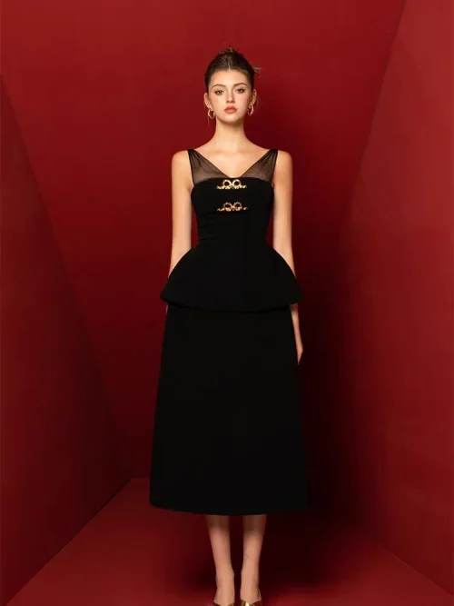 Product Name: 2024 New Women’s Fashion Black Long Dress Socialite Style Waist Slimming Elegant Women Dress Set