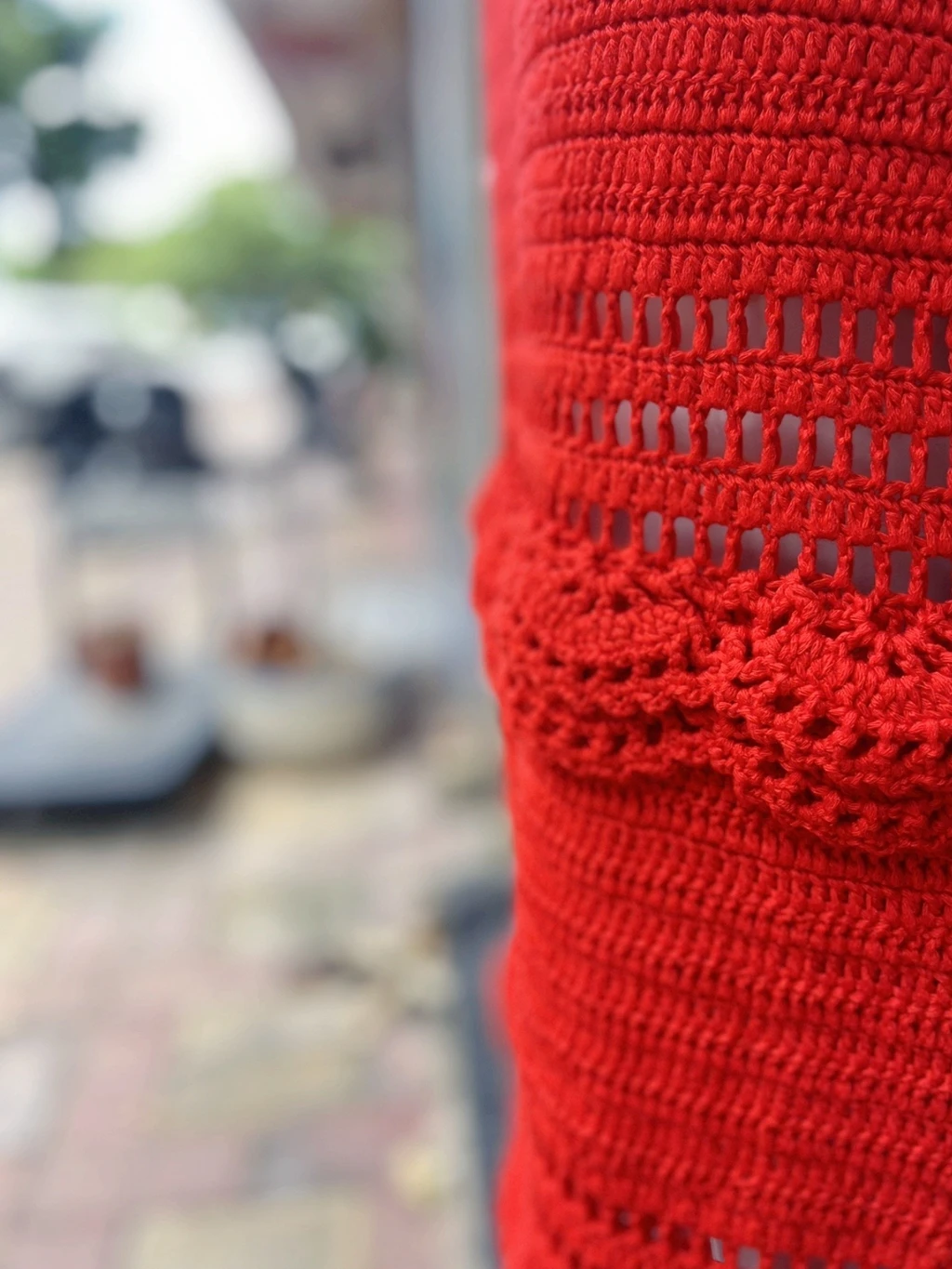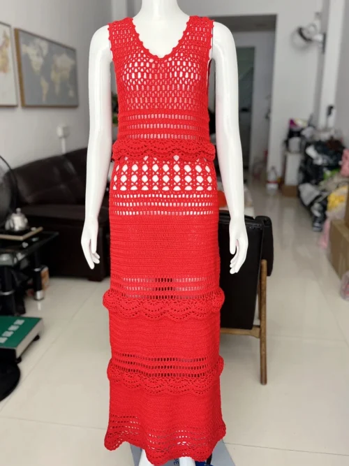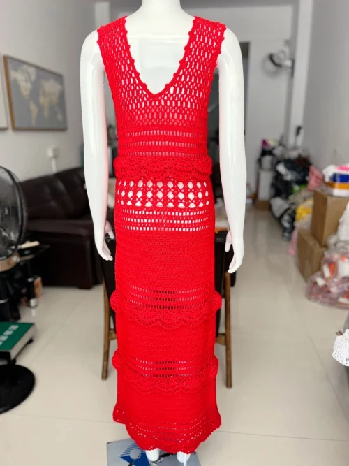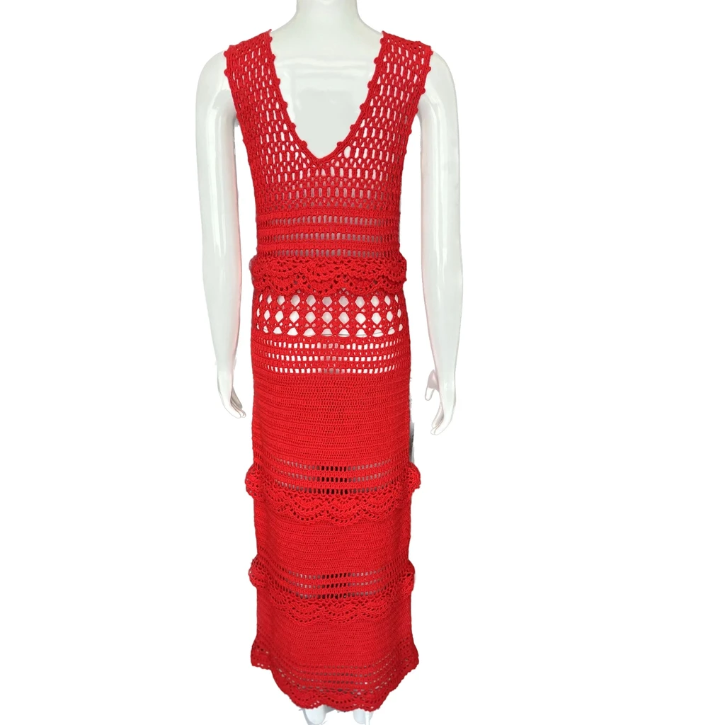 2024 Red Crochet Maxi Dress Sleeveless Vacation Beachwear Hollow Sexy See V-Neck Ruffles Patchwork Pattern Woven Acrylic
