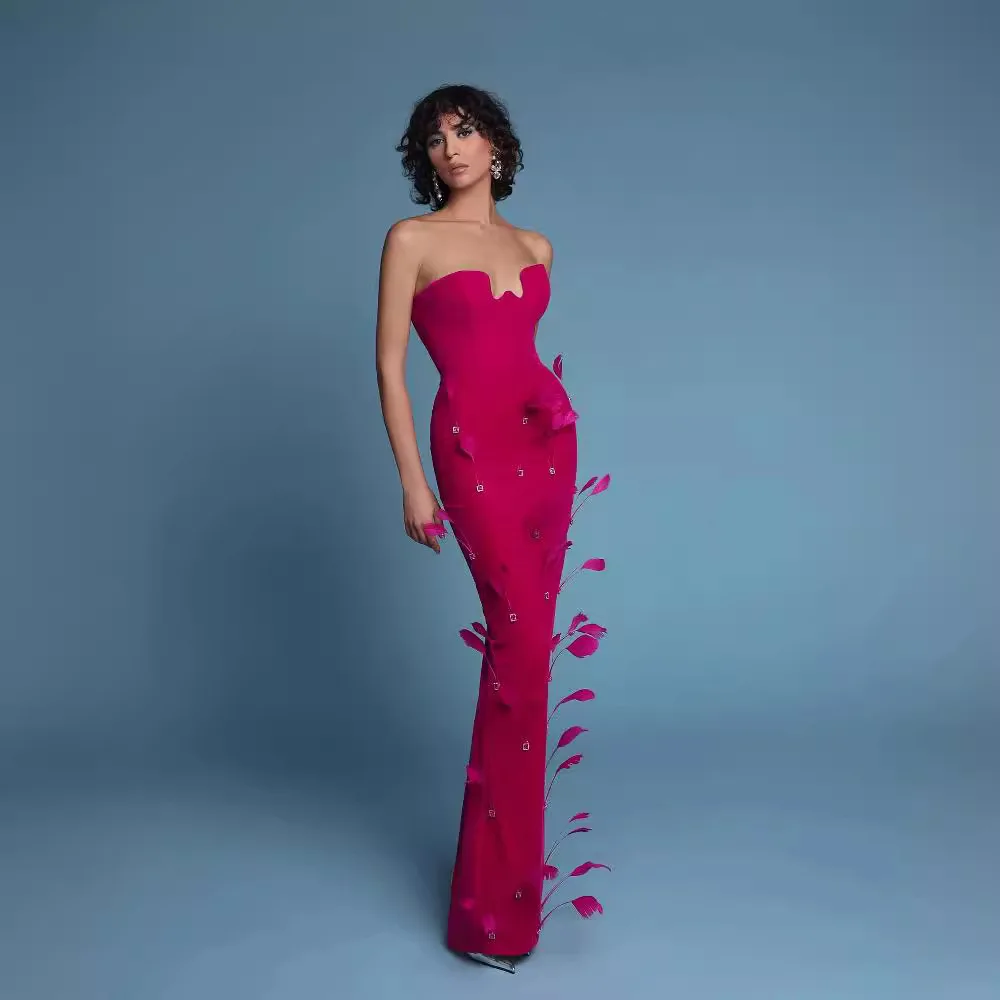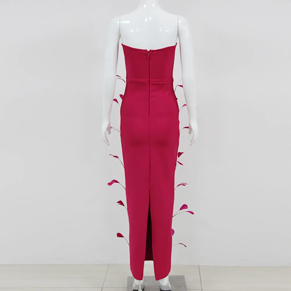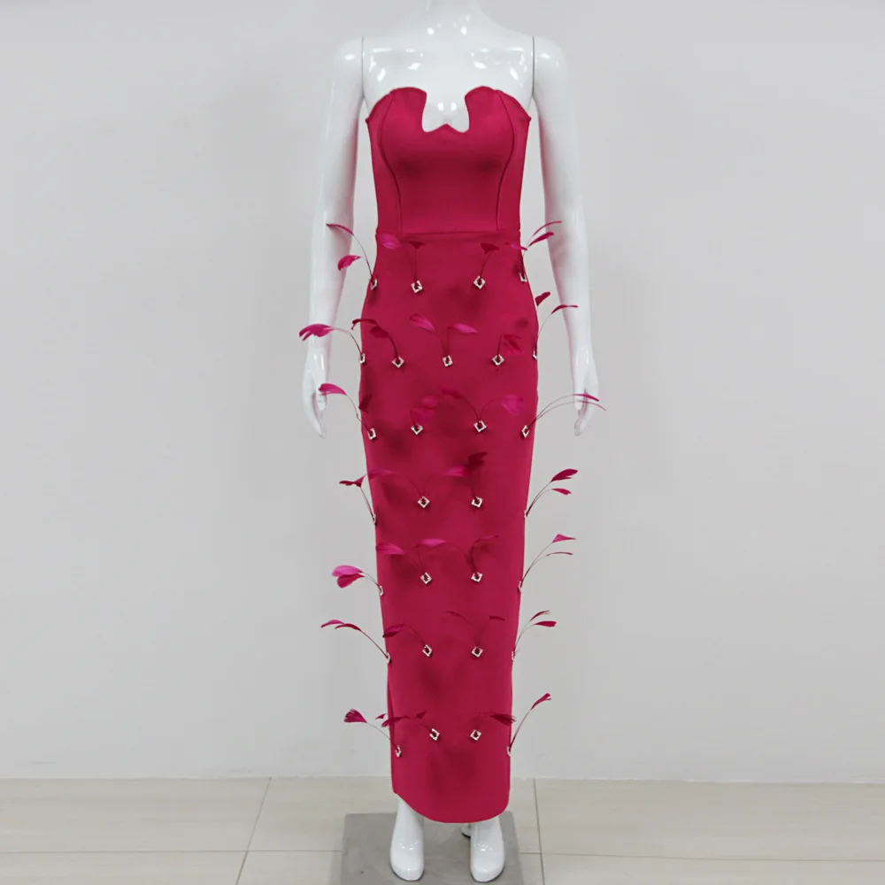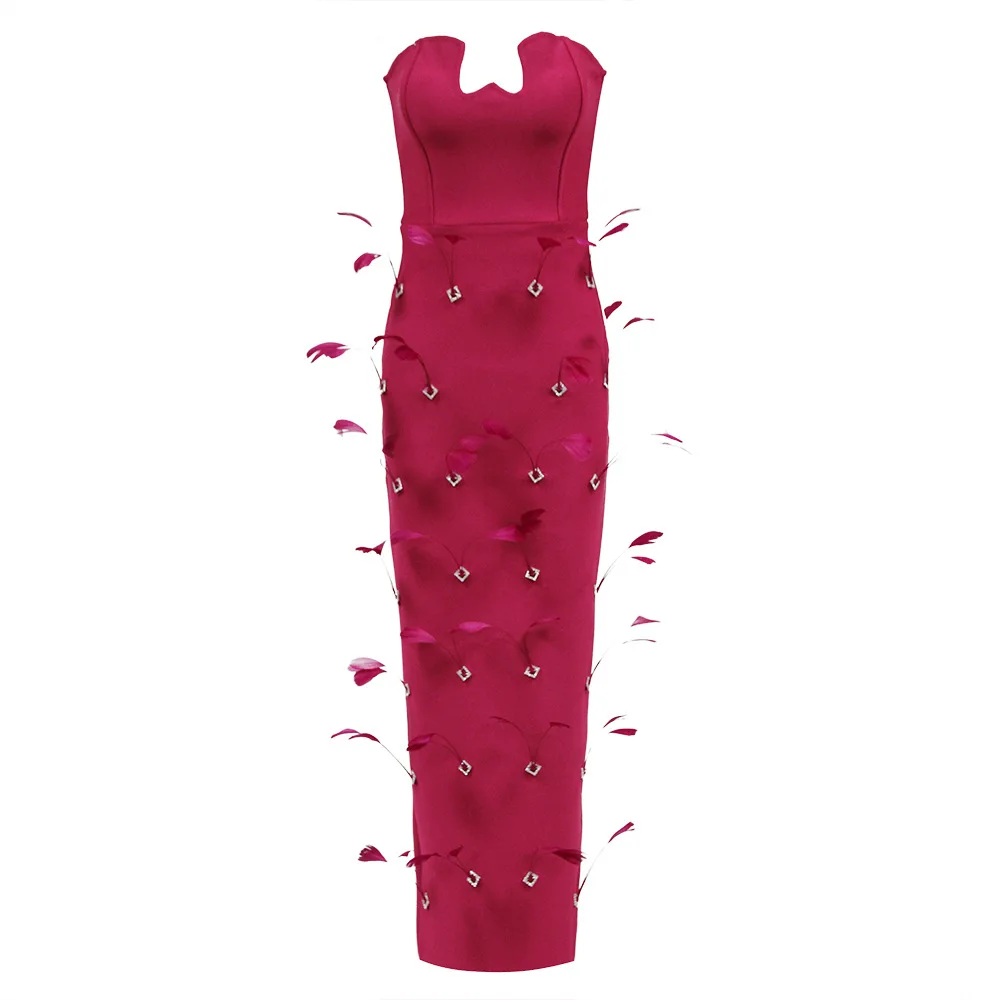 2024 Summer New Fashion Metal Feather Bandage Dress Sexy Rose Red Long Dress