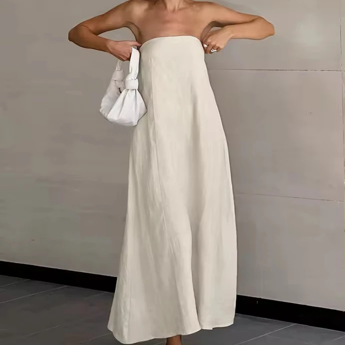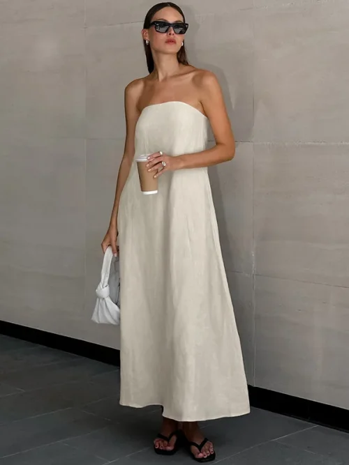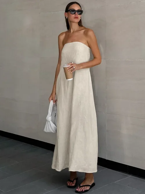 Product Name: 2024 Summer New High-Waisted Breast Holiday Backless Dress for Women French Khaki Cotton Hemp Top Long Casual Style