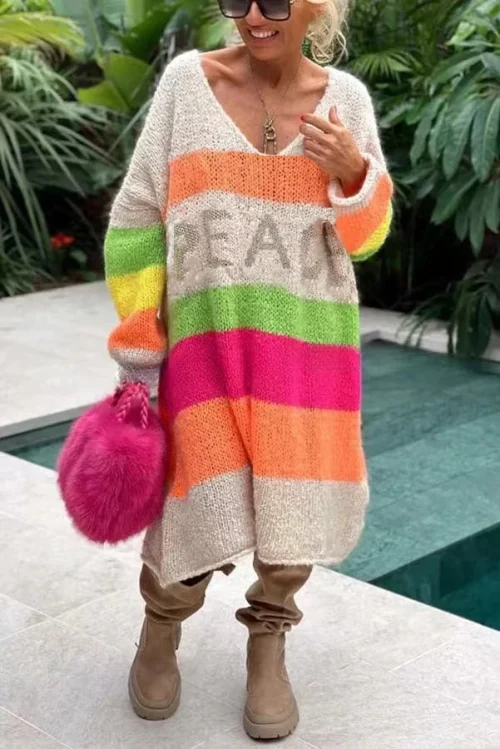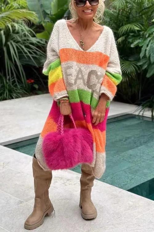 Product Name: 2024 the Latest Fashion Trend Beautiful Color Striped Letter V-neck Casual Party Home Street Women’s Knitted Dress