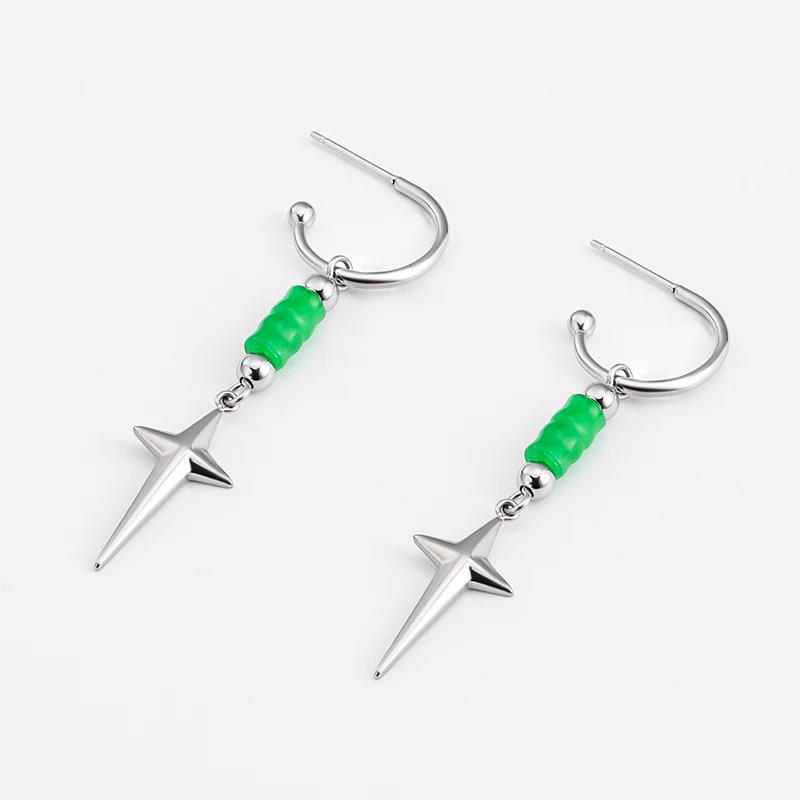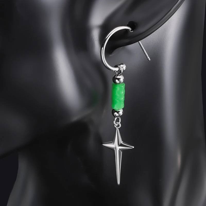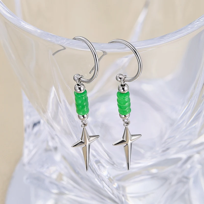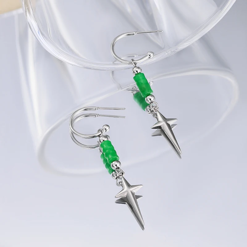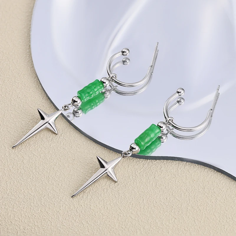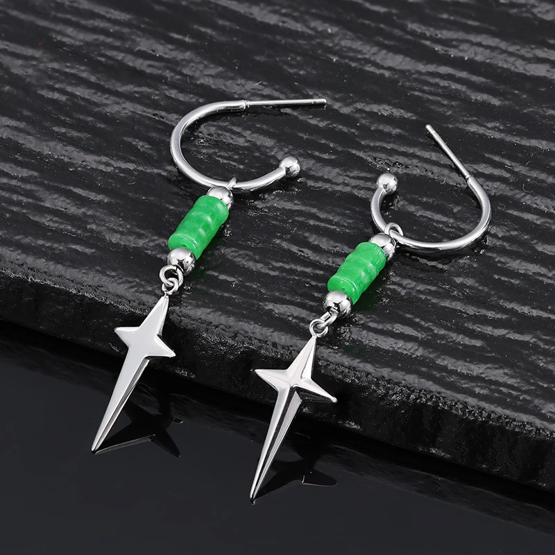 2024 Unisex Vintage New Design Long Drop Green Jade Bead Earring Stainless Steel Star Stud Perfect Gift for Him & Her