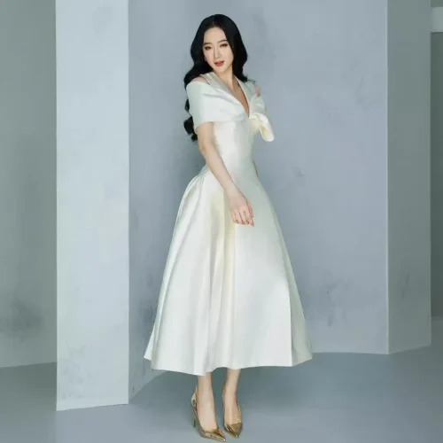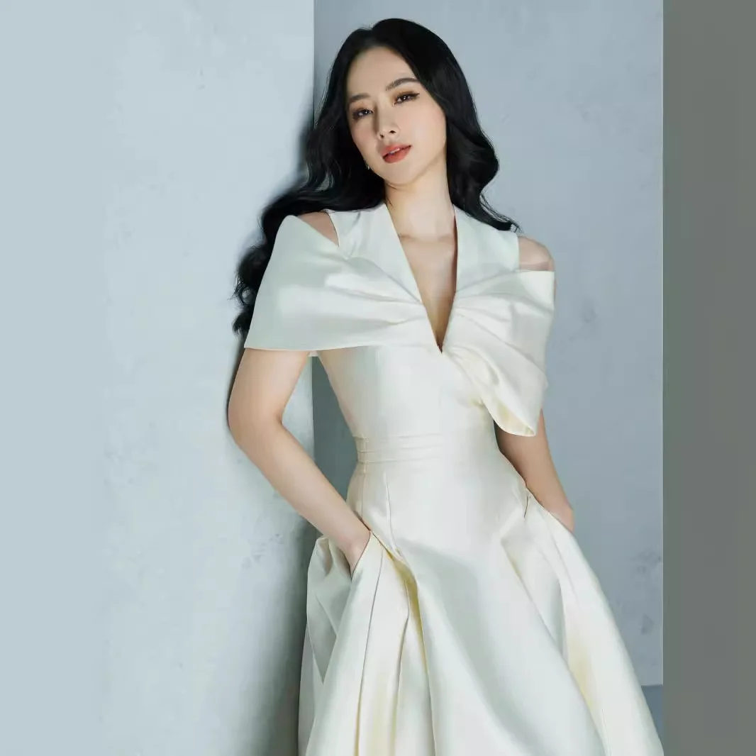 Product Name: 2024 Vietnam Elegant Satin White Banquet Dress with Niche V-neck Bow Pleated Sleeves Slim and Woven Design