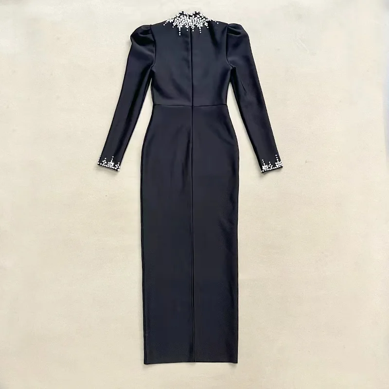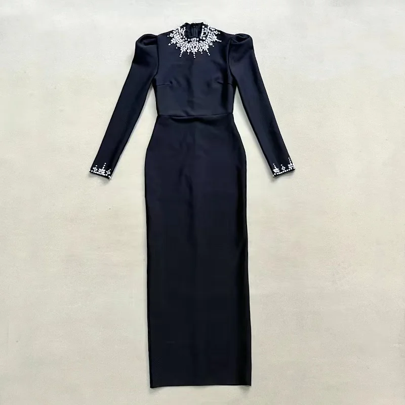 2025 Black Luxury Slim Evening Dress for Women High Collar Long Sleeve Split Banquet Casual Style Crystal Decoration