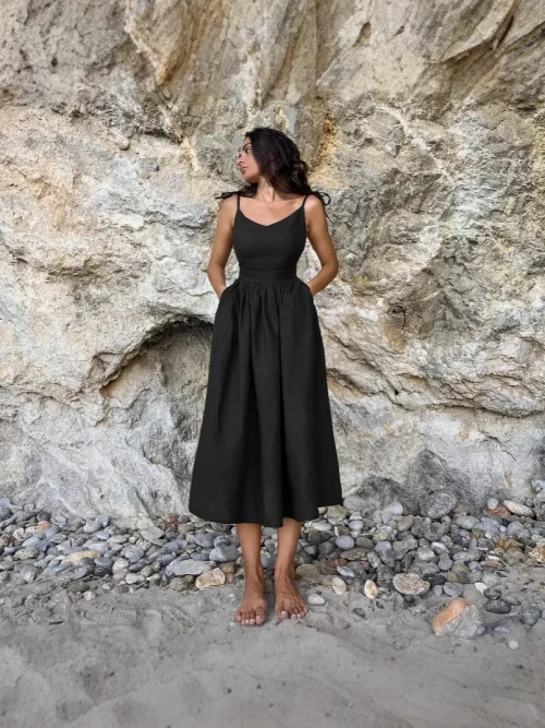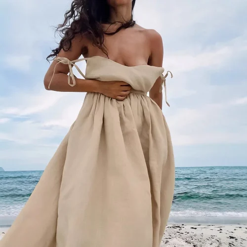 Product Name: 2025 European American Spring New Vacation Style High Waist Dress for Women French Style Khaki Cotton Linen Solid Lace