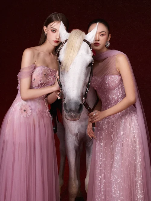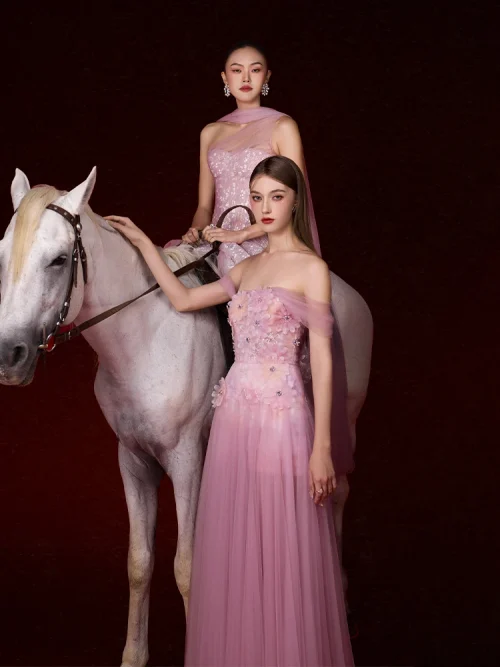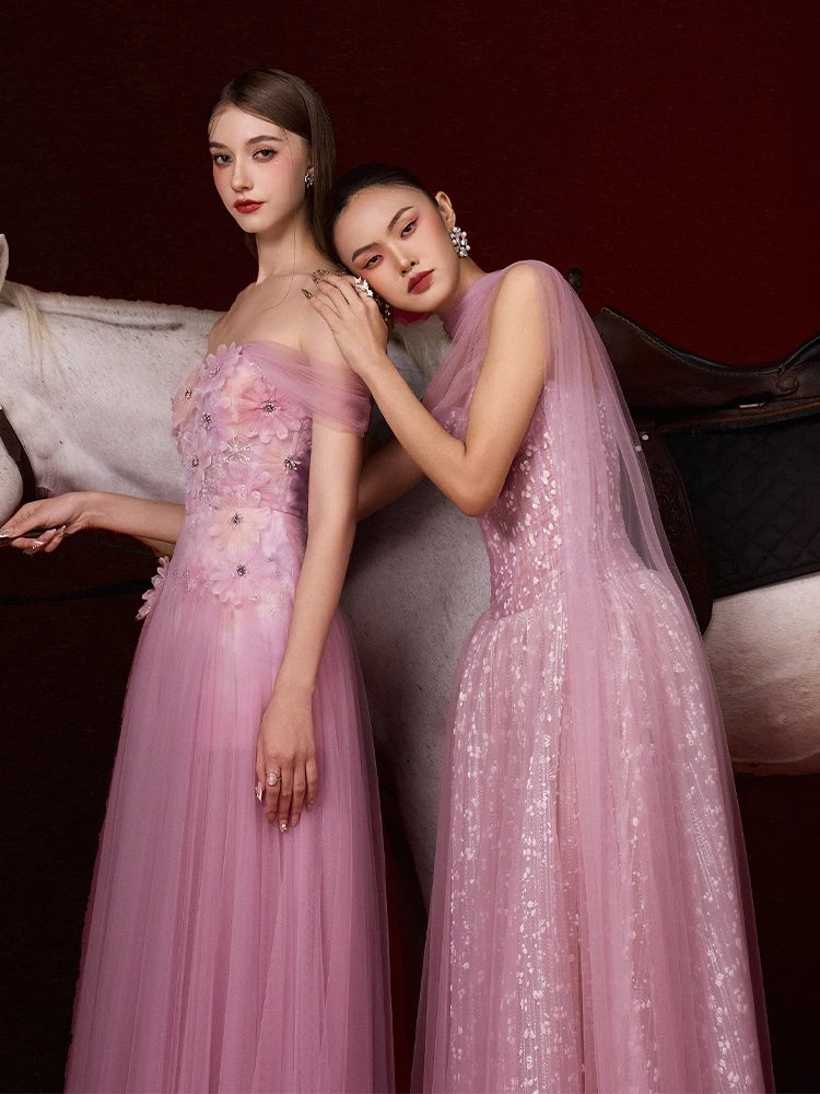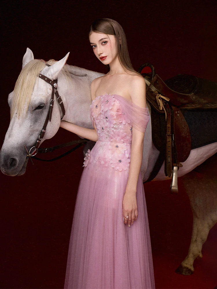 Product Name: 2025 Luxury Floral 3D Mesh Pleated Dresses Women Maxi Evening Dress High Quality Pink Strapless Long Sexy Party Dress