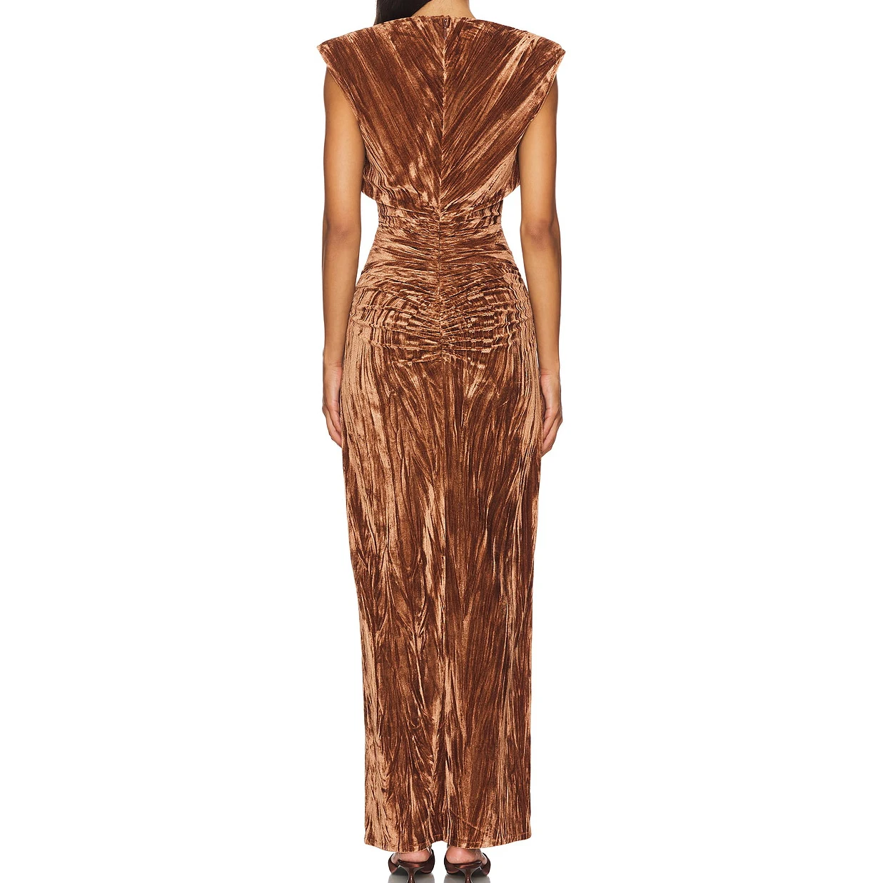 Product Name: 2025 New Fashion Lady Elegant Women Clothing Brown Sexy Plunge Crushed Velvet Sleeveless Ruched Formal Evening Maxi Dress