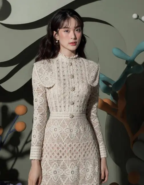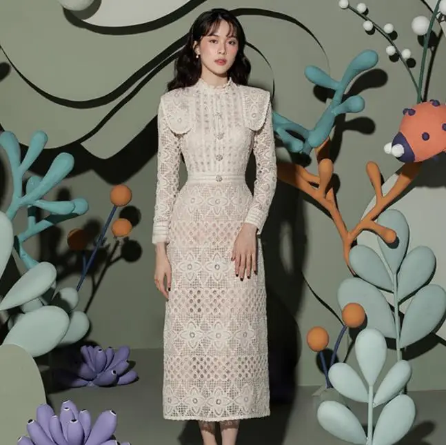 2025 New Long Sleeve Hollow Dress Women High Waist a Line Lace Long Dress Female Korean Fashion Party Evening Dress
