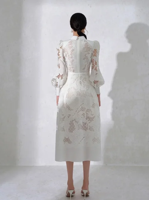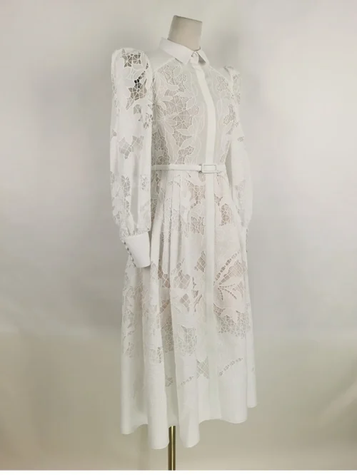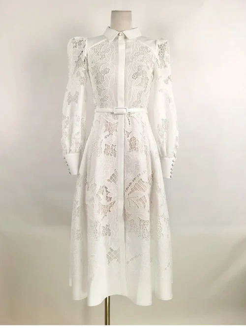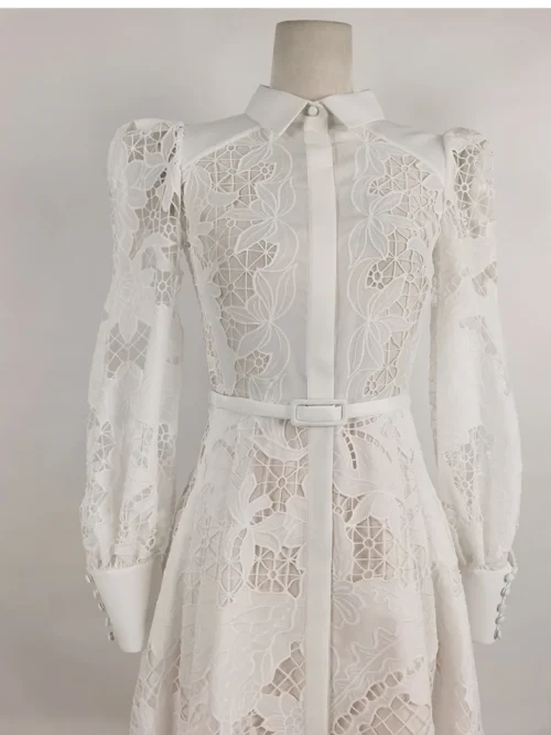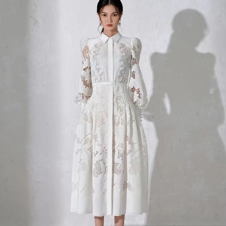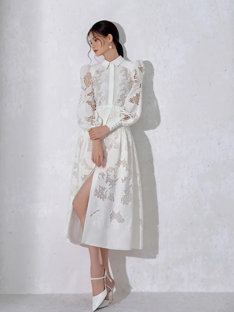 2025 New Luxury White Elegant Dress- Summer Long Dress with Long Sleeve High Collar White Cutout Plus Belt