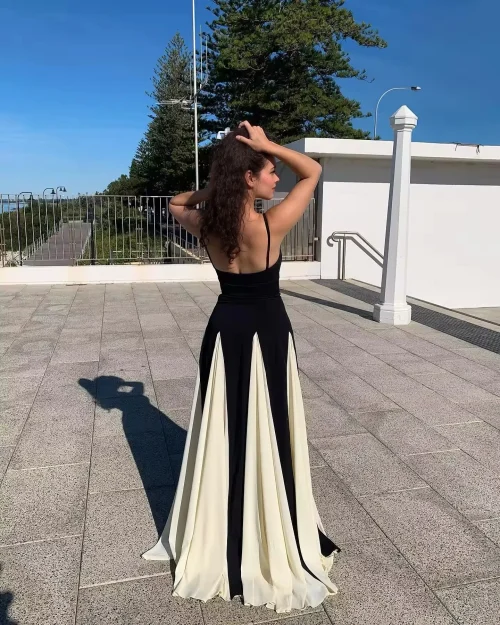 Product Name: 2025 Olaesa New Design Elegant Sleeveless Knitted Chiffon Tulle Patchwork Maxi Dress Black White Hem Sling Dress
