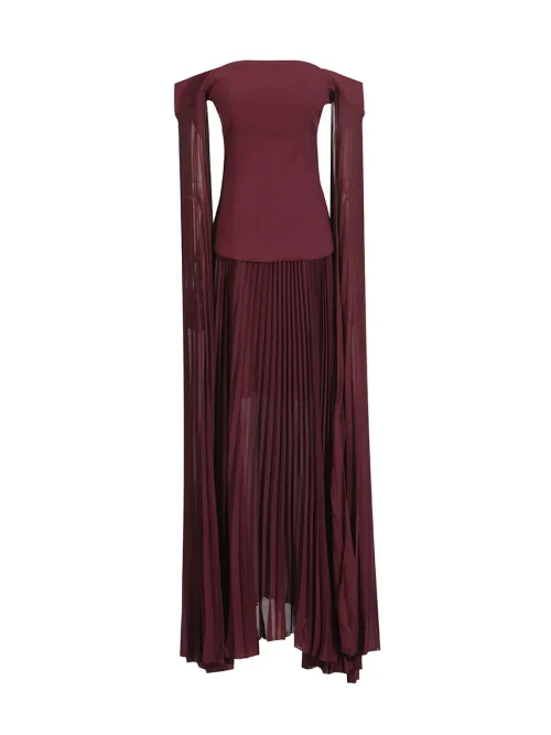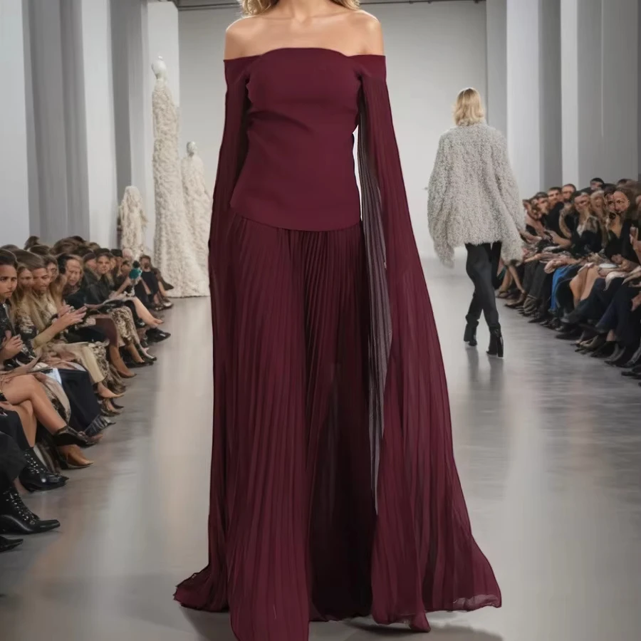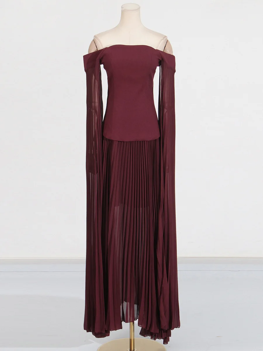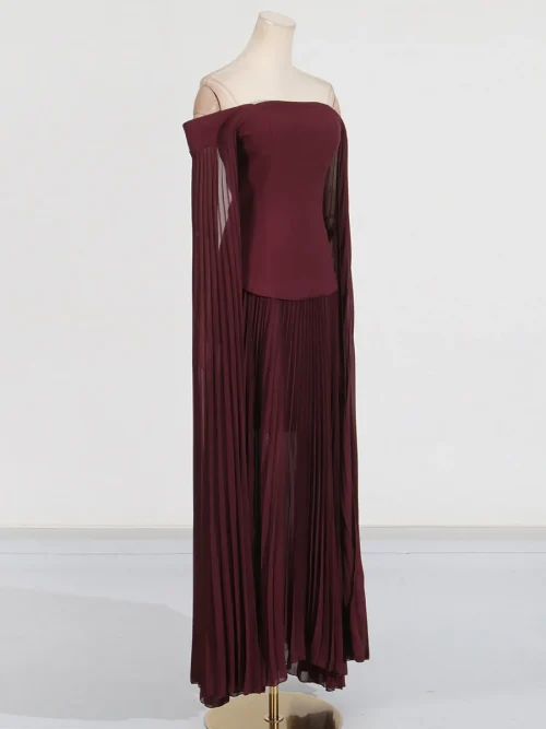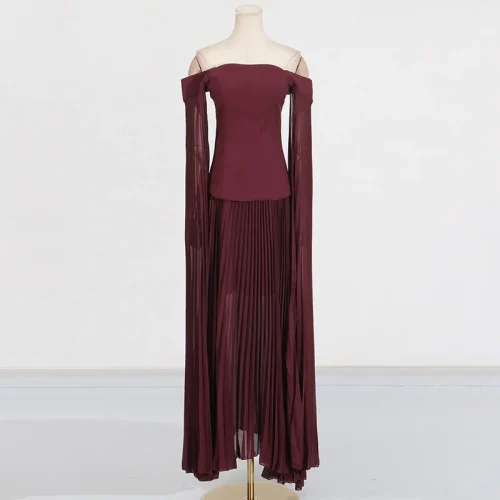2025 Spring New Fashion Best Ladies Suit Mesh Pleated Long Sleeve Elegant Shoulder Stitching Angora Red Casual Dress