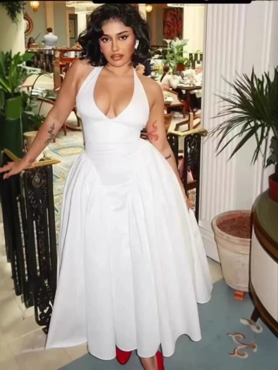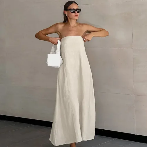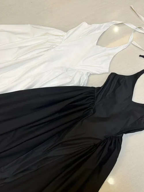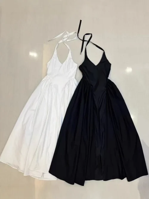 2025 Spring Summer Collection Women’s Elegant Vintage French Dress V-Neck Strap Draped Front Empire Long Elegant Dress