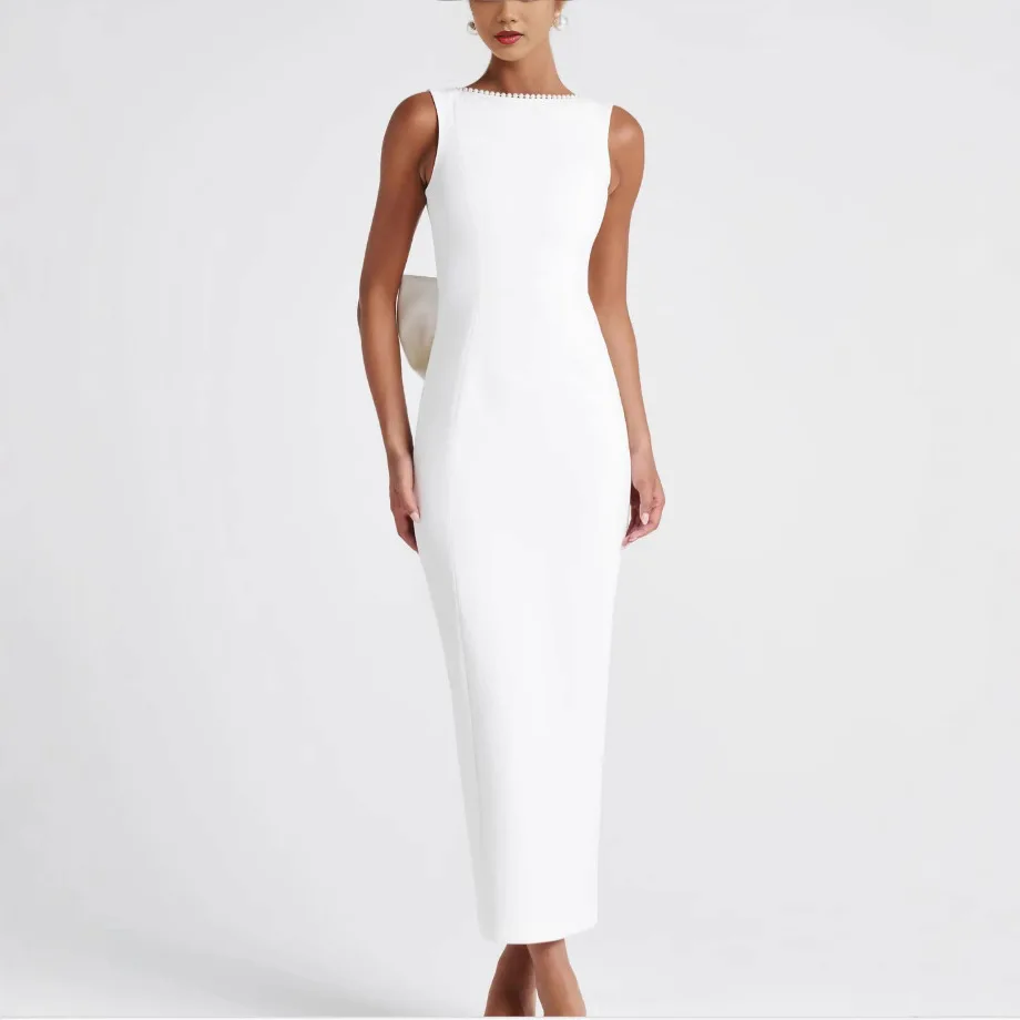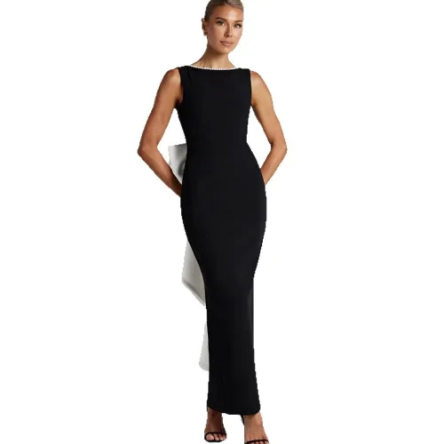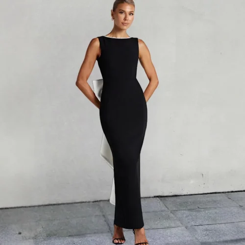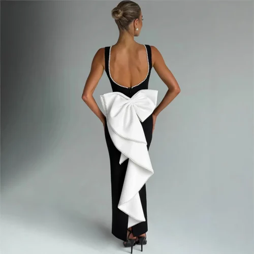 Product Name: 2025 Spring Summer Sleeveless Dress in Black White Celebrity Style Casual New Sexy Backless Pearl Bow Floor-Length Long Dress