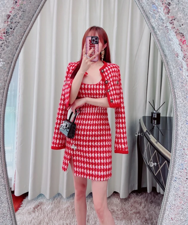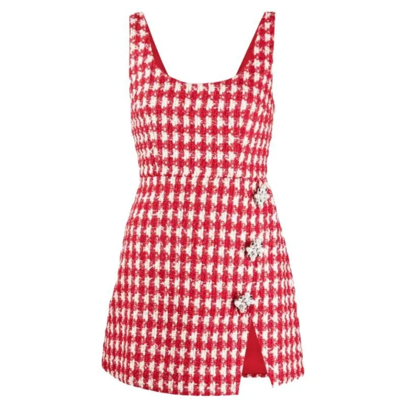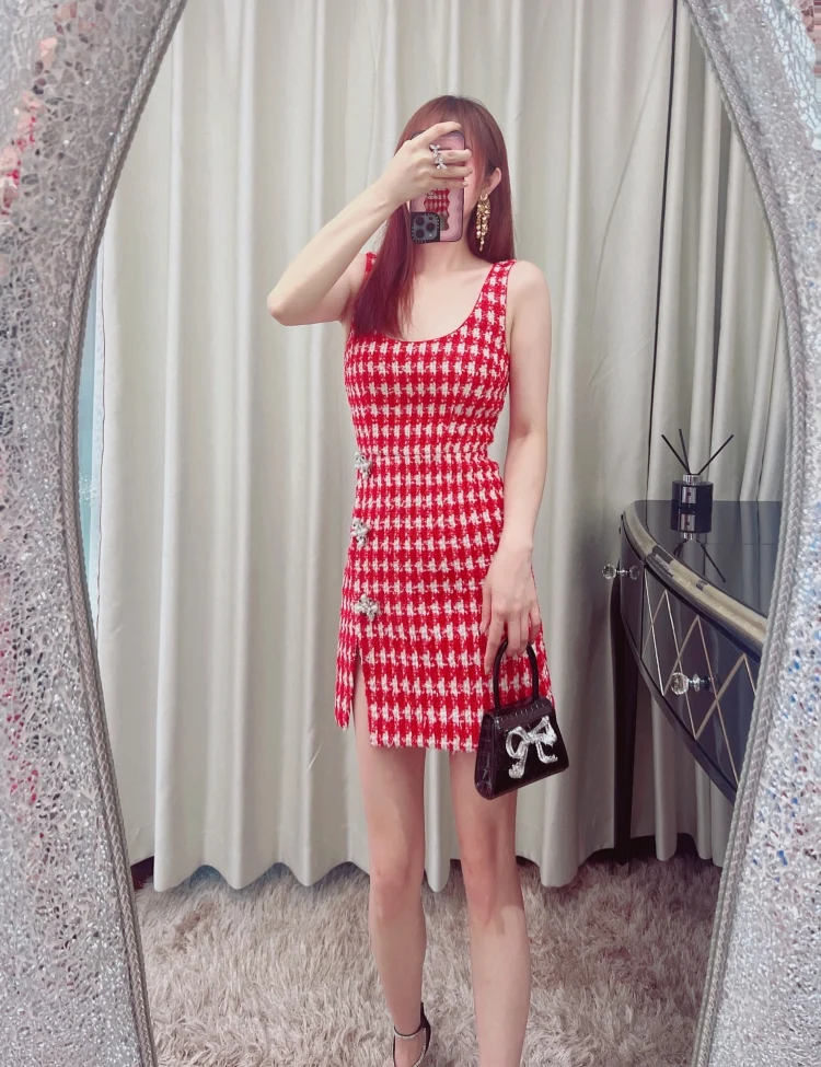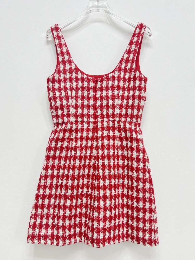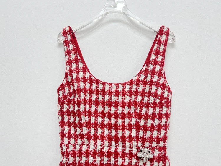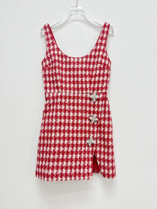 Product Name: 2025 Women’s Casual Tweed Dress Mini Grid Design with Square Collar Summer Dress Featuring Rhinestone Buttons