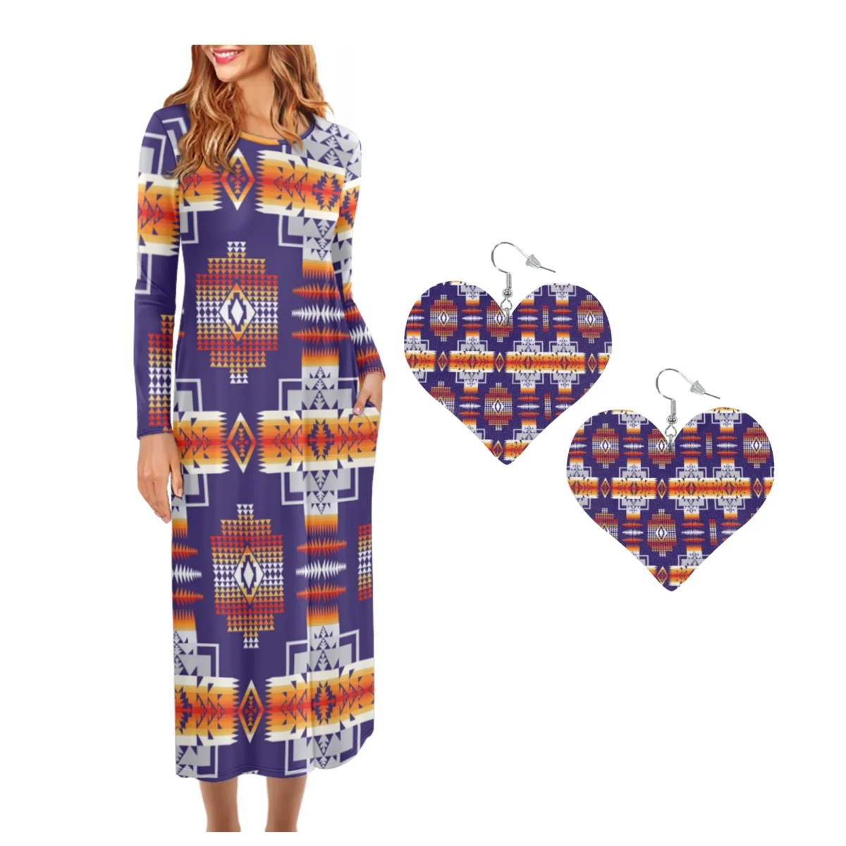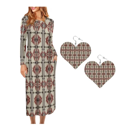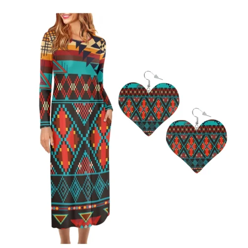 Abstract Tribal Aztec Pattern O Neck Long Sleeves Dress Matching Leather Heart Earrings Set of 2 Fashion Party Dresses Drop Ship