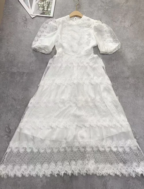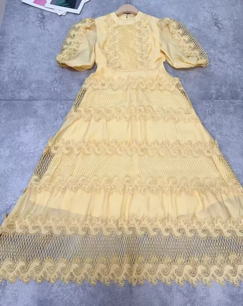 Product Name: AELESEEN 2025 Spring Summer Puff Sleeve Midi Dress Women Runway Fashion Flower Embroidery Hollow Out Patchwork Elegant Casual