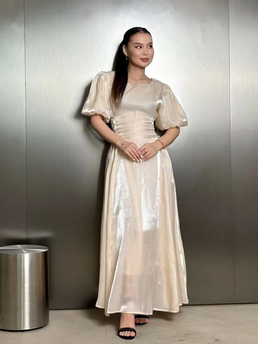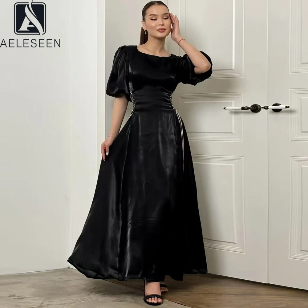 Product Name: AELESEEN 2025 Women’s Casual Midi Dress Spring Summer Puff Short Sleeve Bandage Waist Slim Elegant Holiday Party Evening