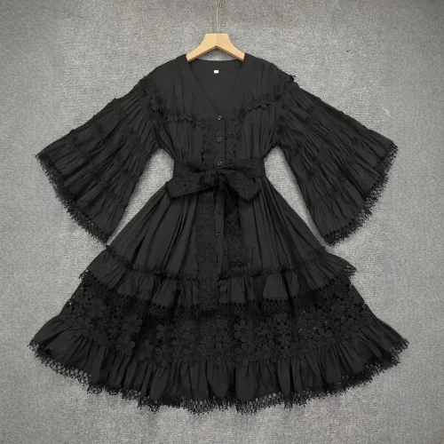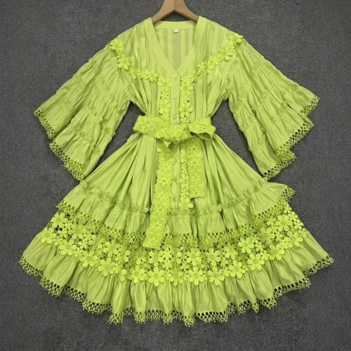 Product Name: AELESEEN Casual Mini Lace Dress Women Spring Summer V-Neck Flare Sleeve Pink Blue Green Black White Ruffles Belt Holiday