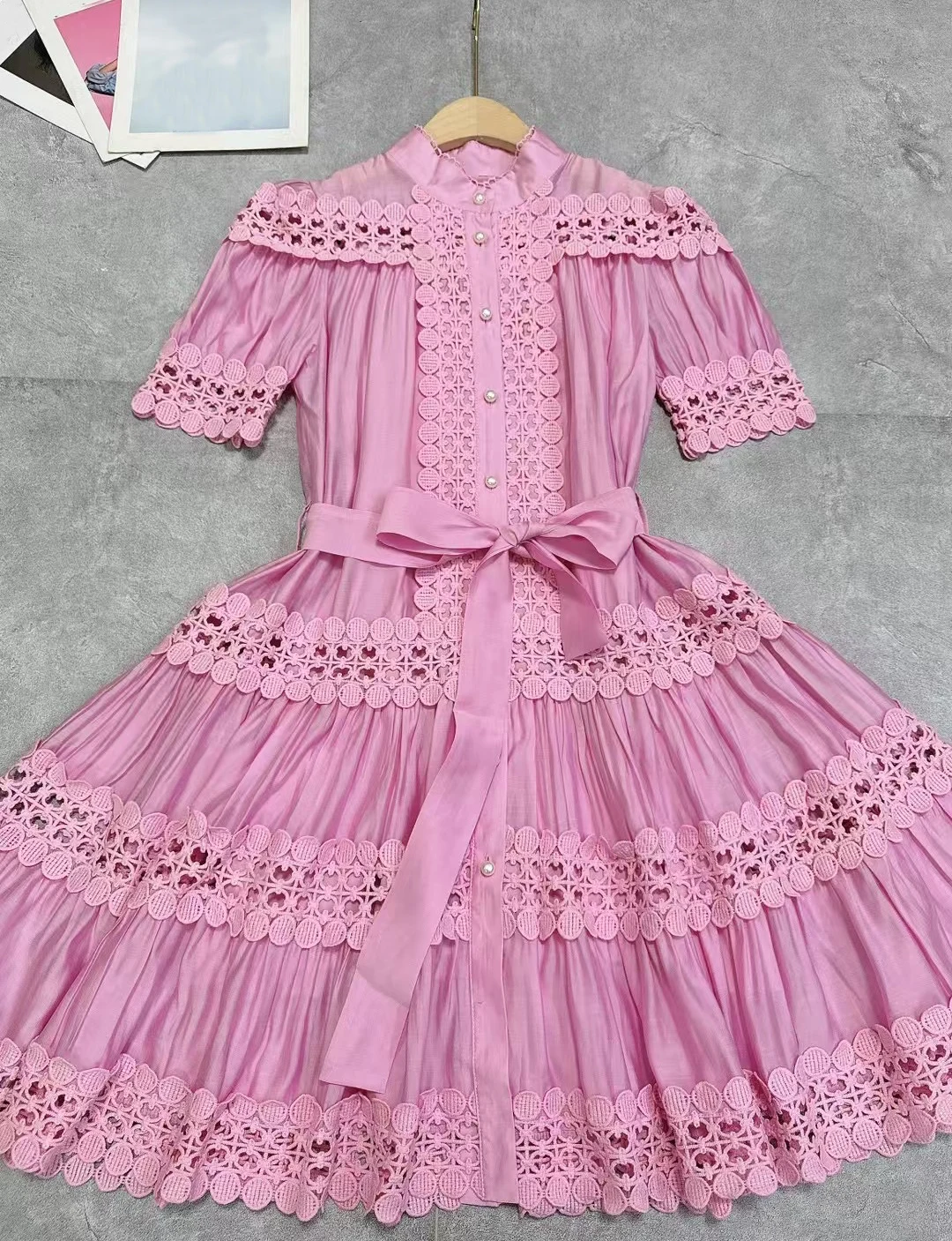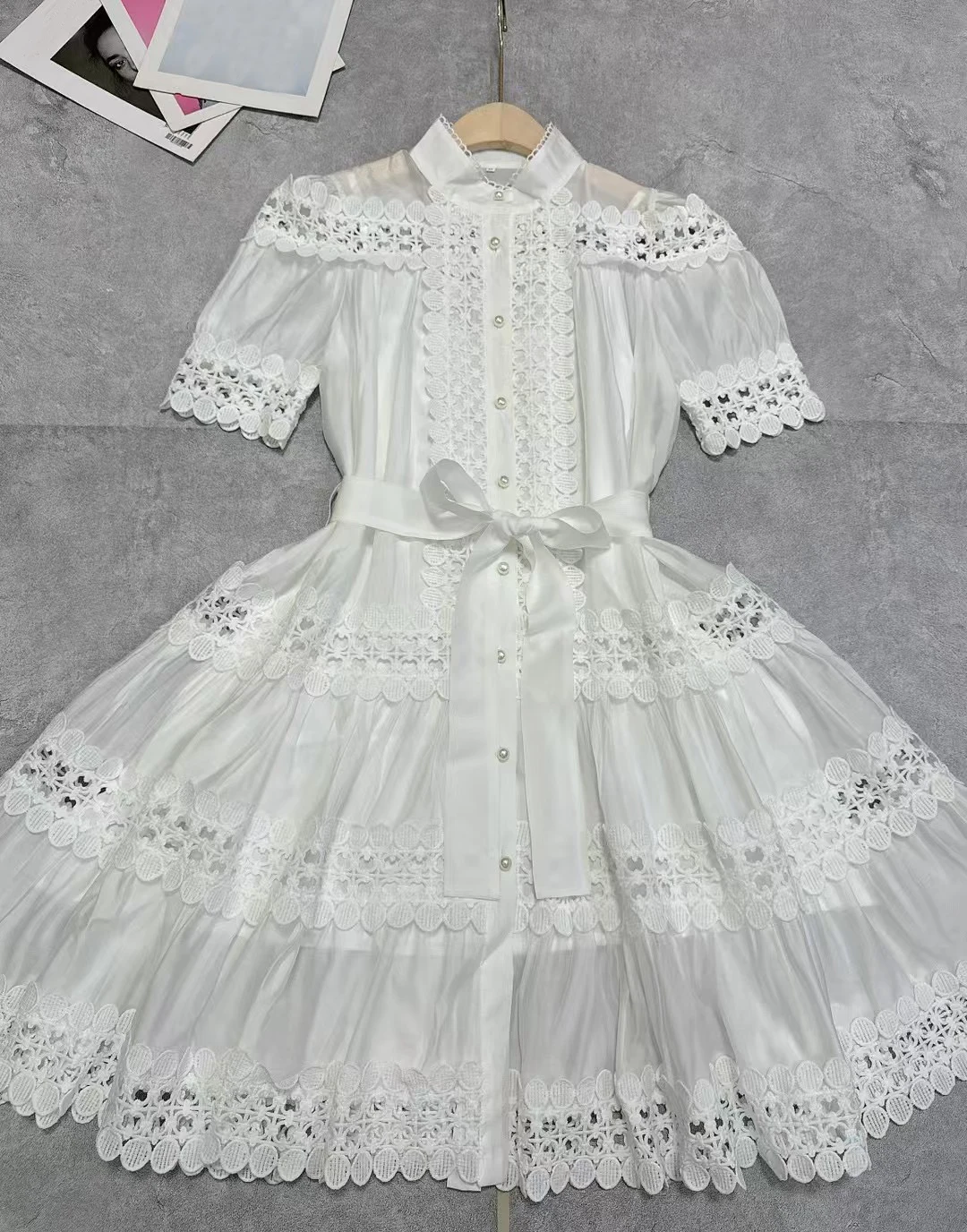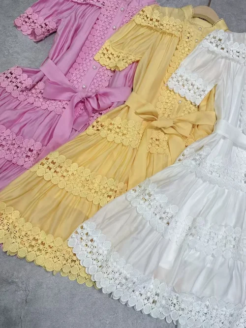 Product Name: AELESEEN Designer Fashion Elegant Mini Dress Women Short Sleeve Hollow Out Embroidered Lace Waist Slimming Ruffles Belt Female