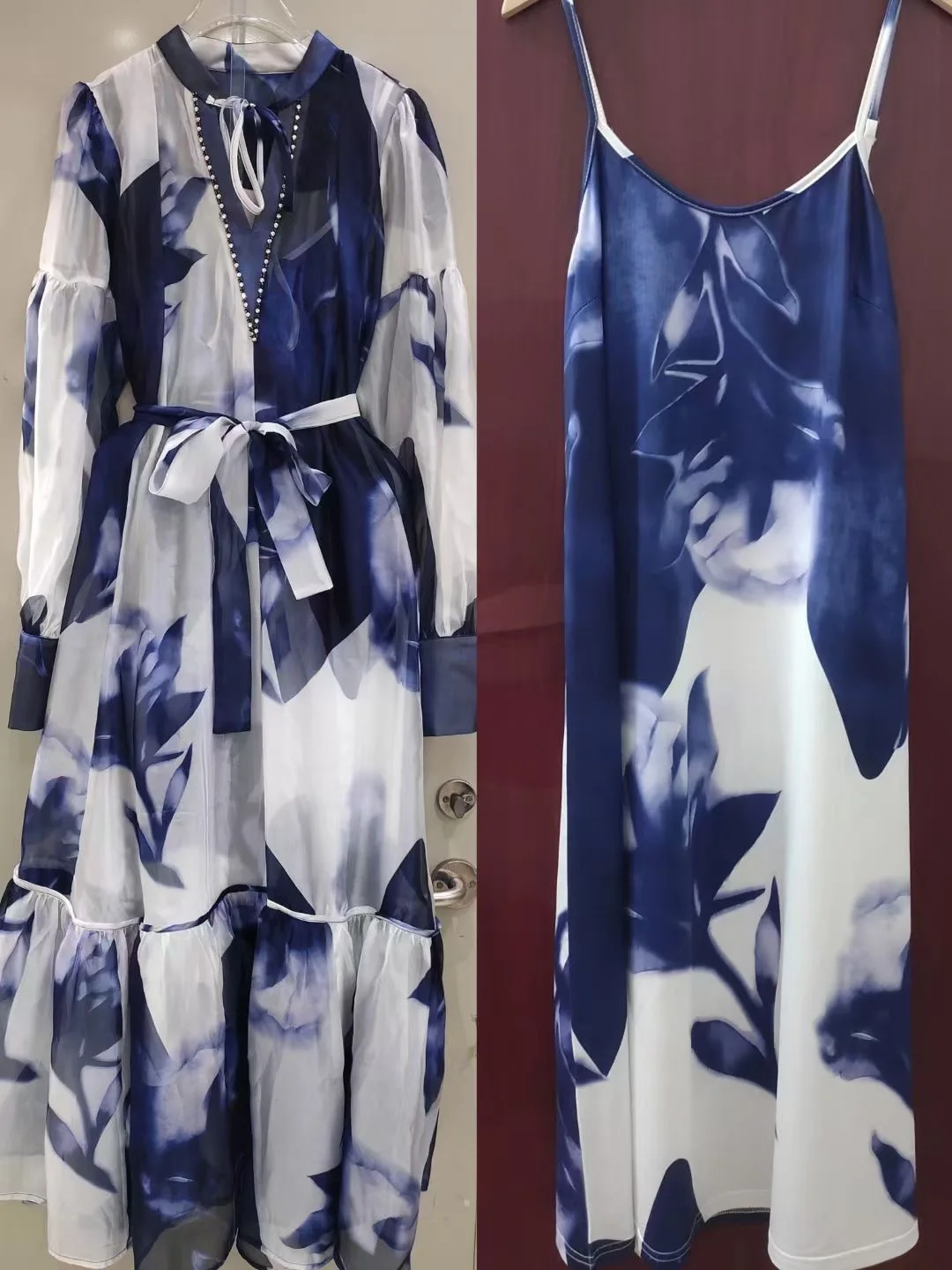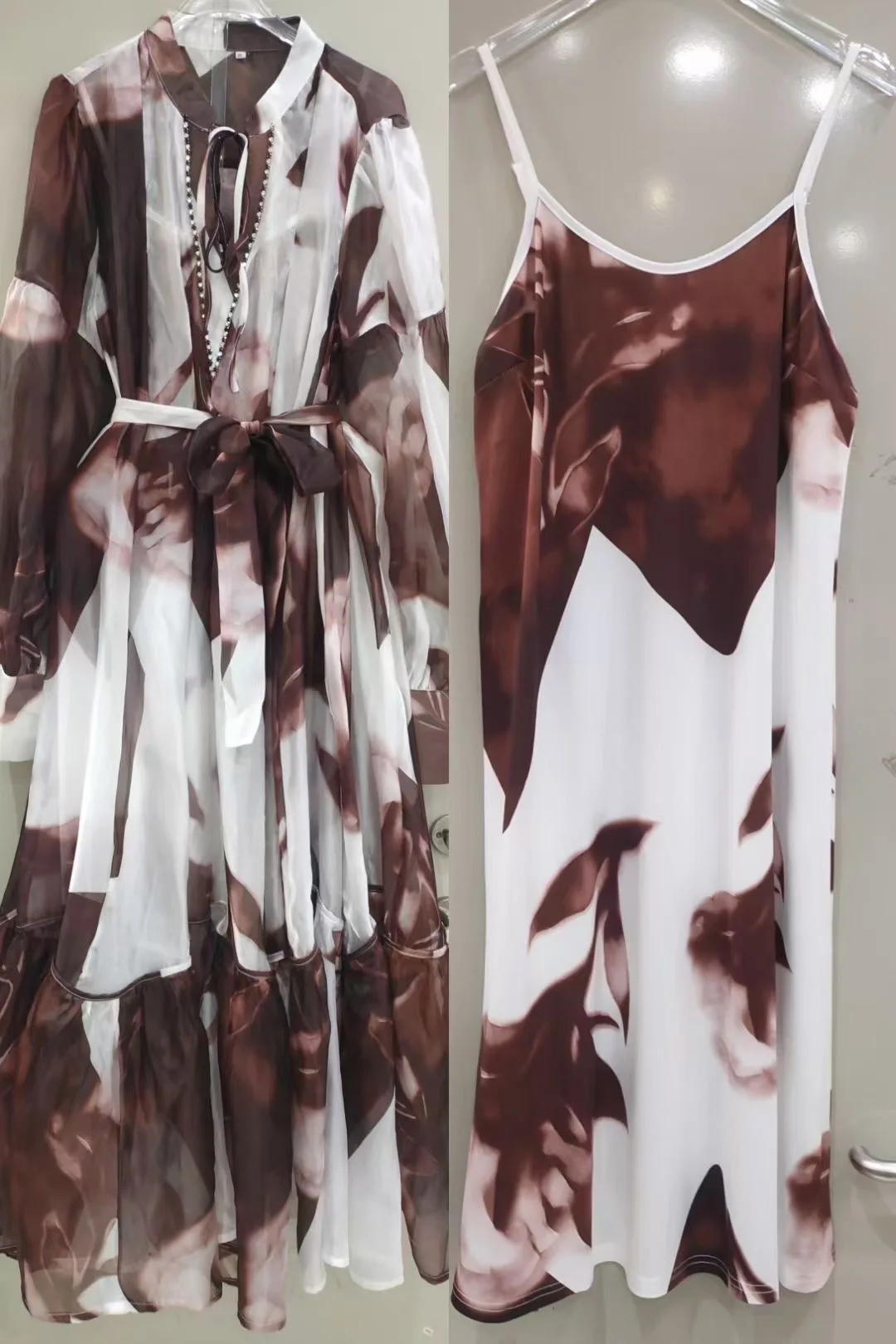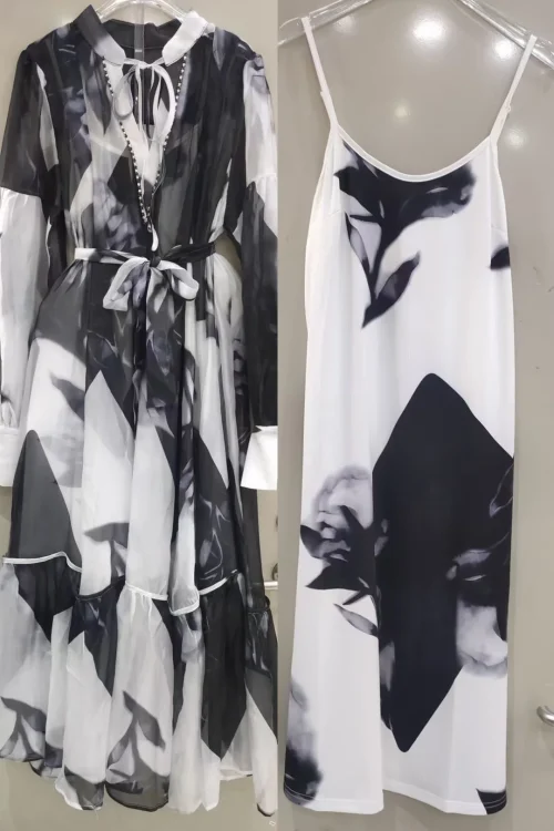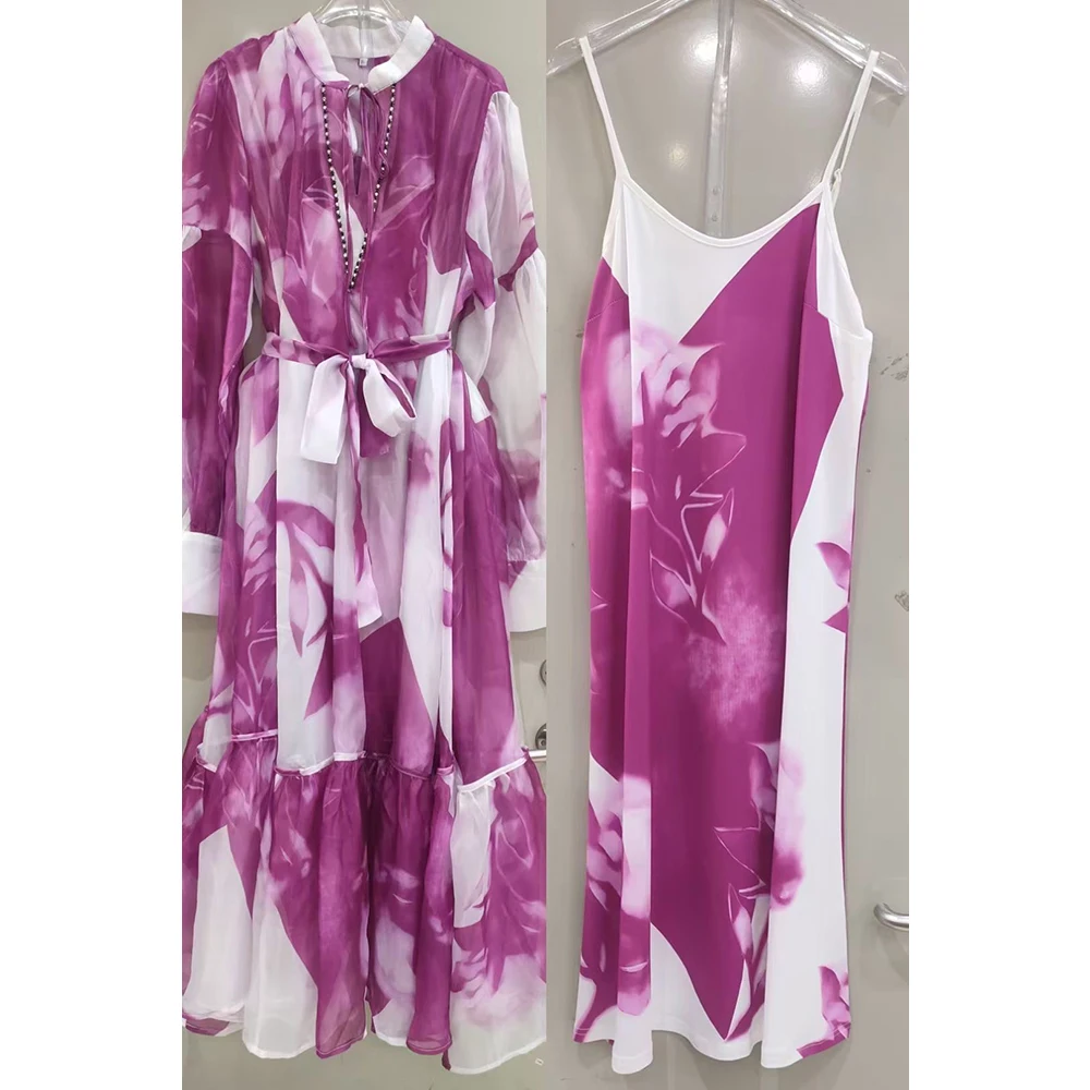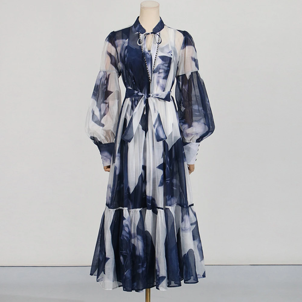 Product Name: AELESEEN Fashion Designer Loose Dress Women 2025 Spring Summer Full Sleeve See-through Flower Printed Belt Casual Midi Party