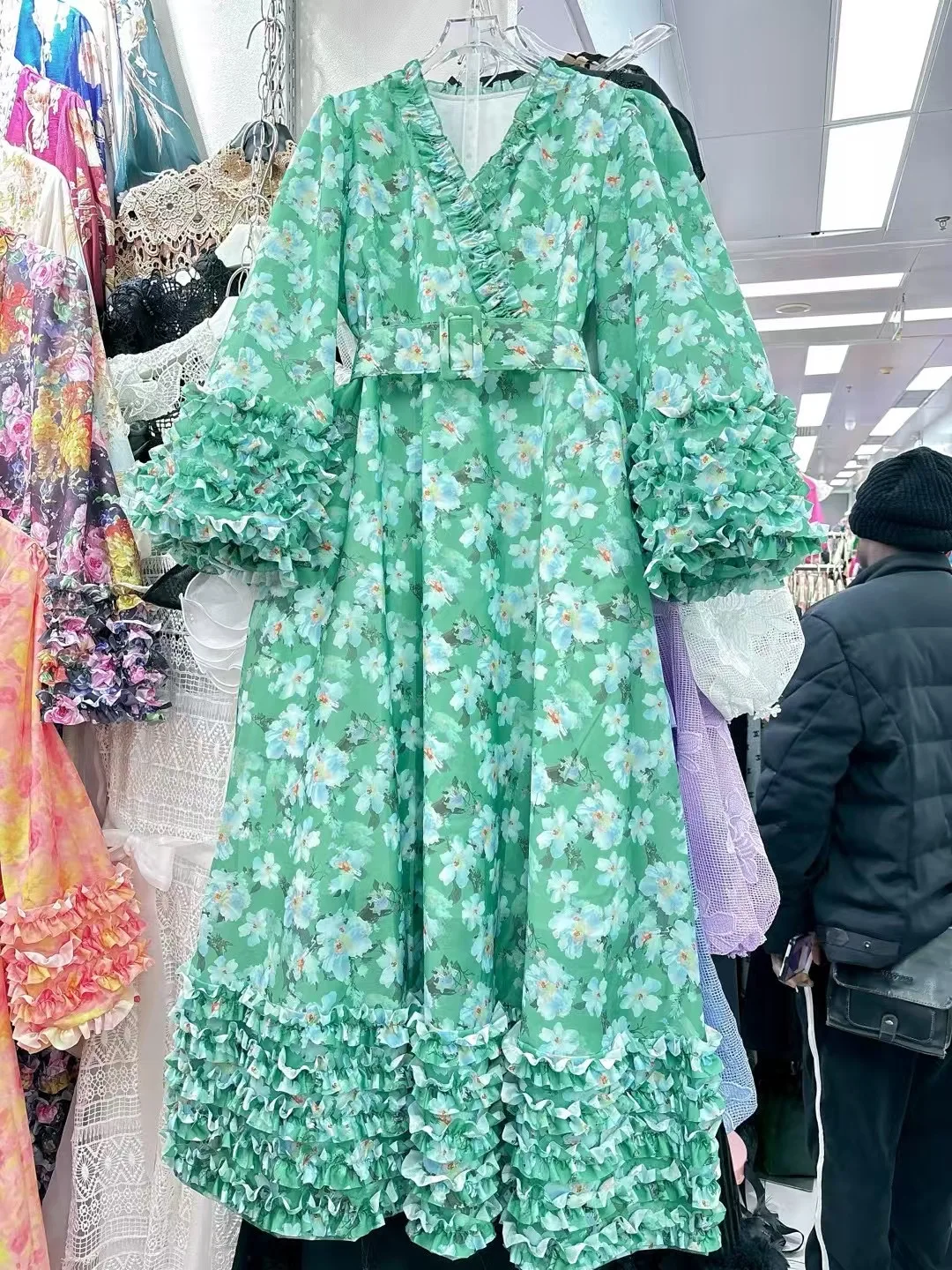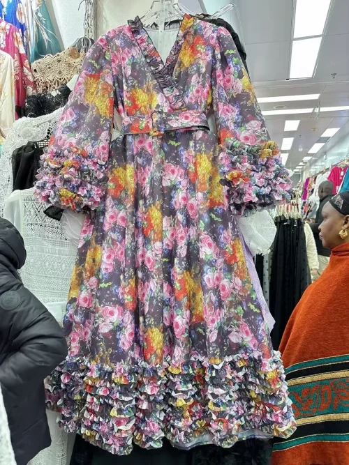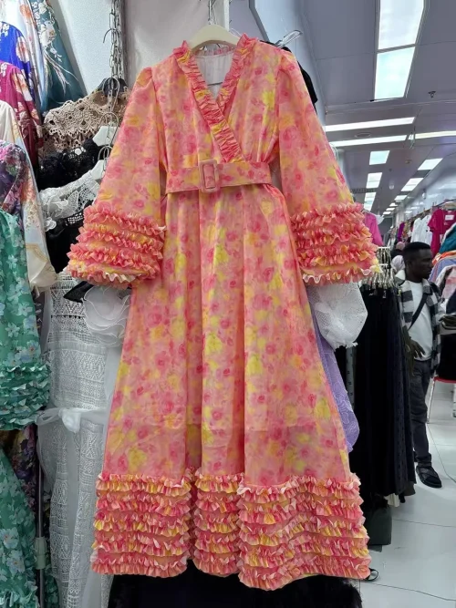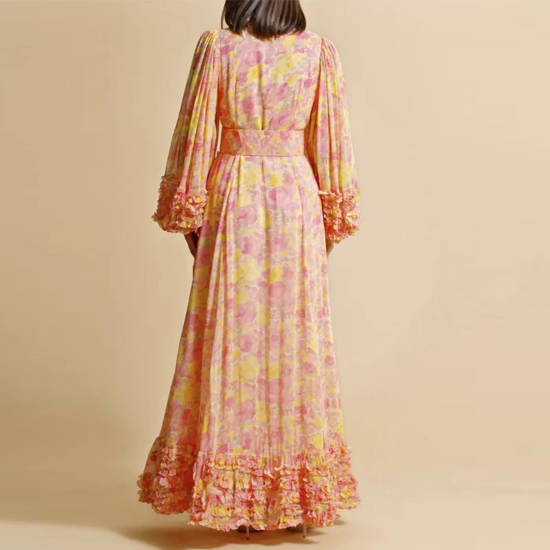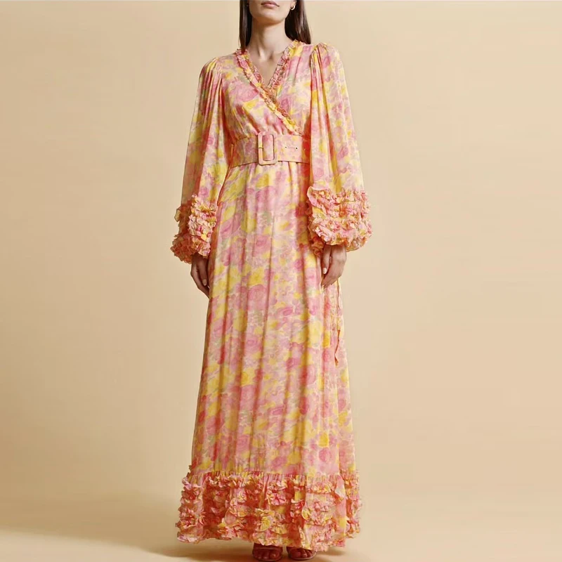 Product Name: AELESEEN Runway Fashion Long Dress Women Spring Sunner Full Sleeve V-Neck Edible Tree Fungues Flower Print Loose Belt Party