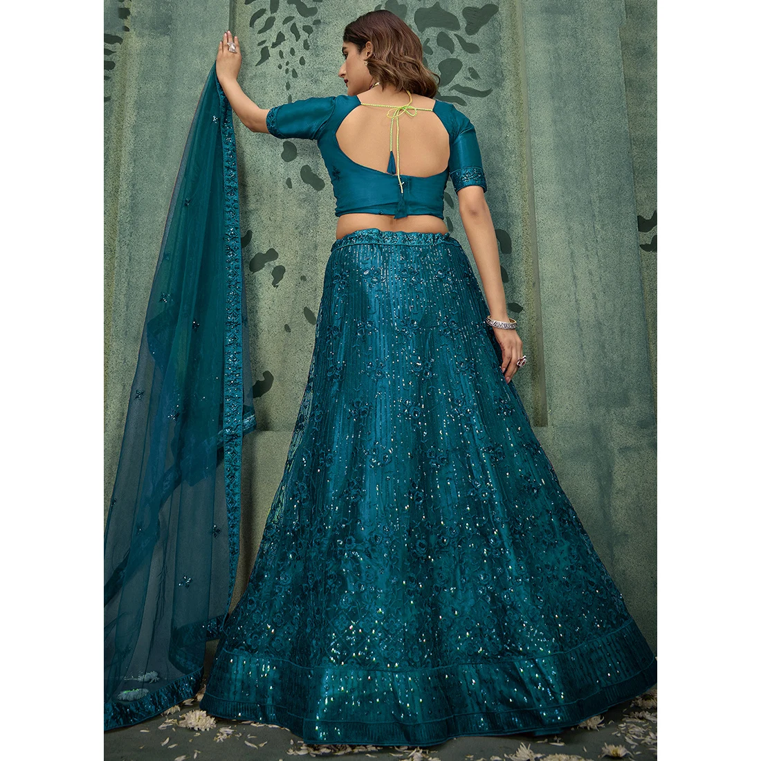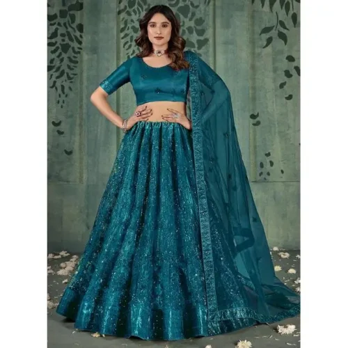 Aqua Blue Embroidery Work Party Wear Butterfly Net Lehenga Choli for Prom Dresses