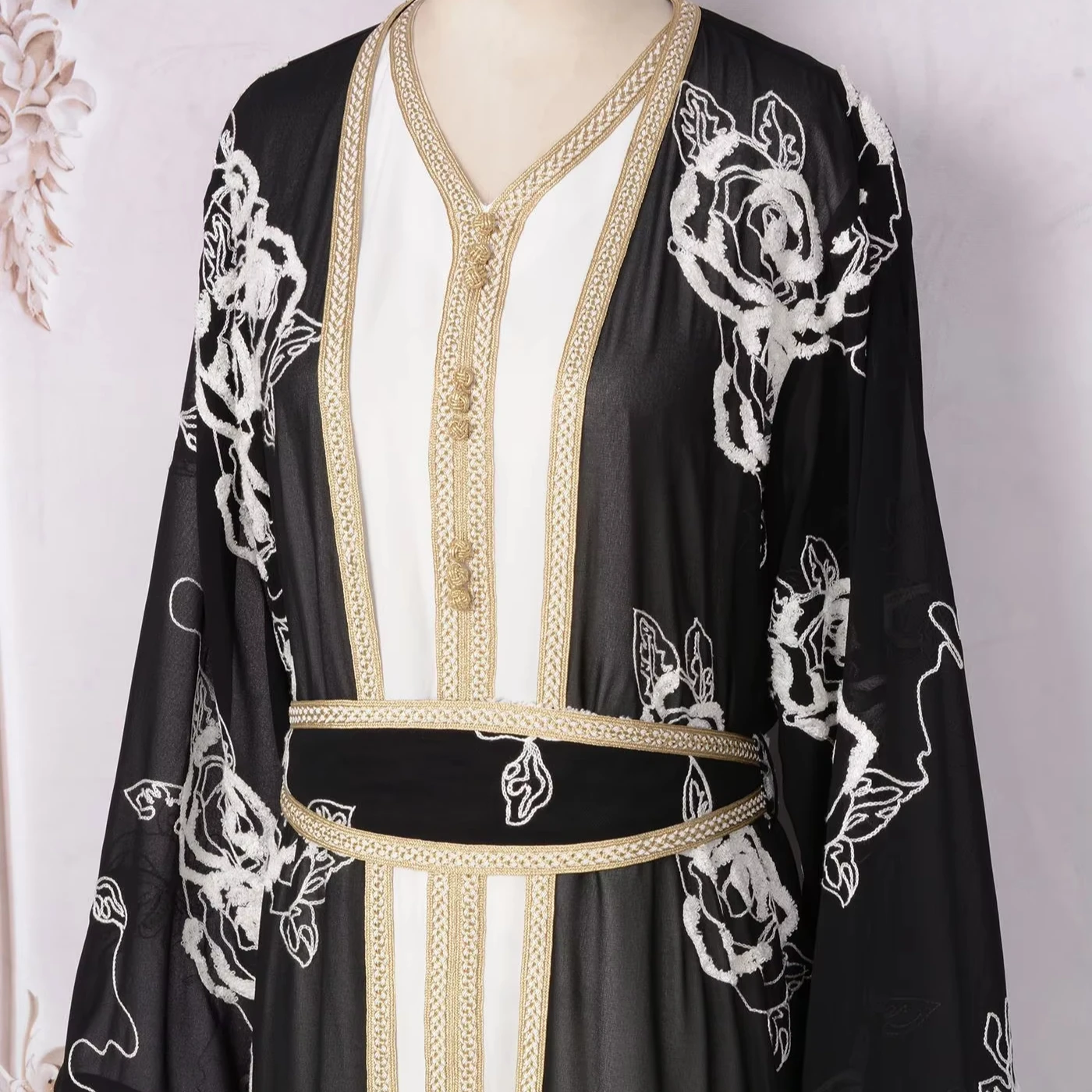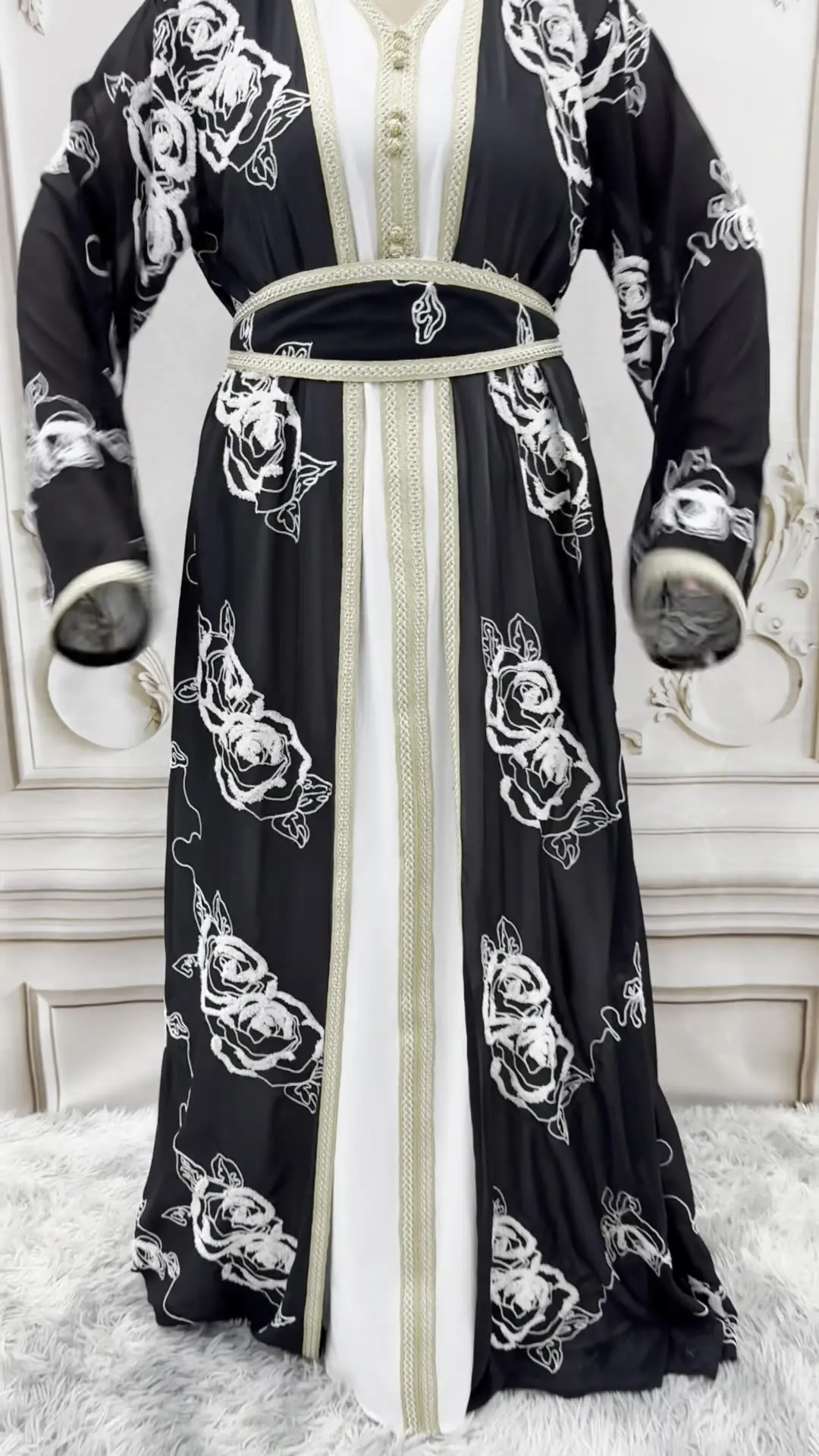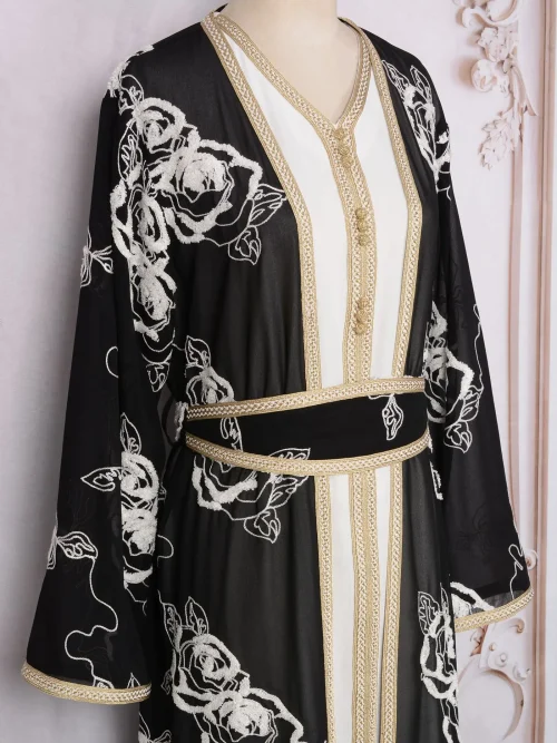 Product Name: Arabian Dubai Black and White Flower Two Piece Set Open Belt Muslim Abaya Hijab Dress Islamic Muslim Clothing Women