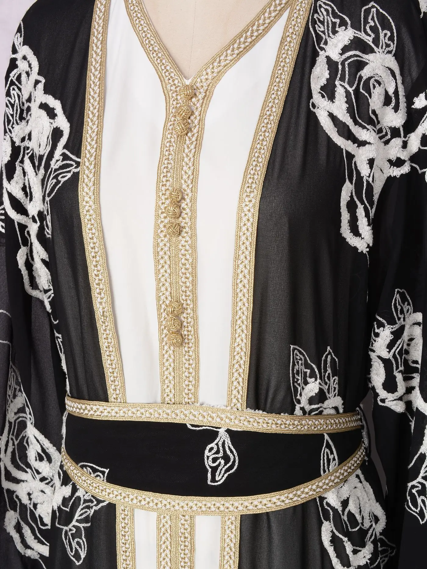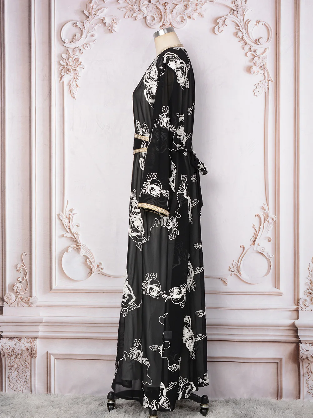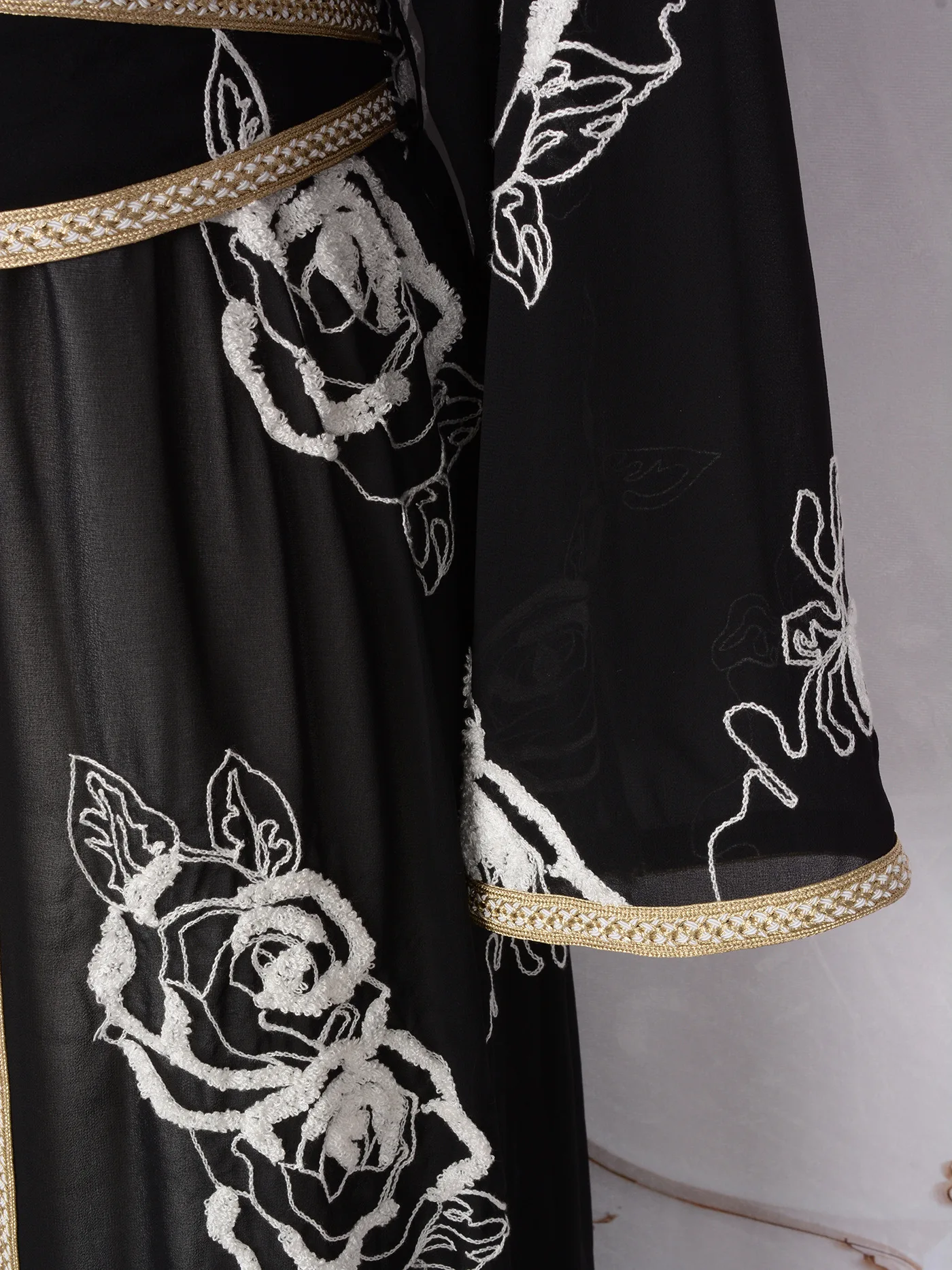 Product Name: Arabian Dubai Black and White Flower Two Piece Set Open Belt Muslim Abaya Hijab Dress Islamic Muslim Clothing Women