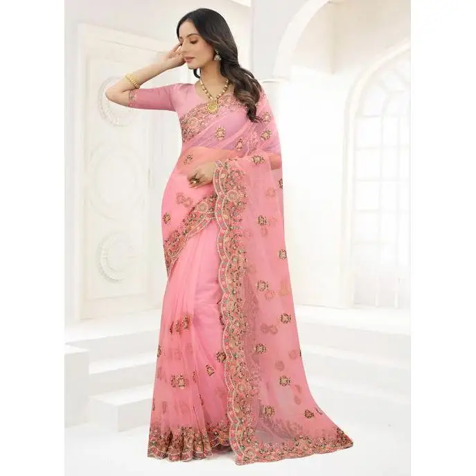 Attractive Pink Resham Work Net Saree Elegant Evening Dresses