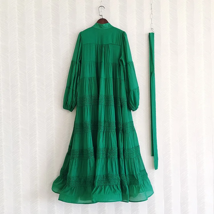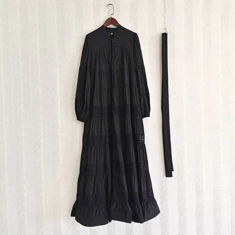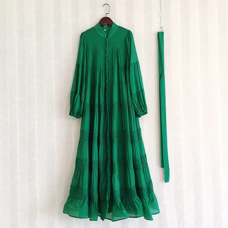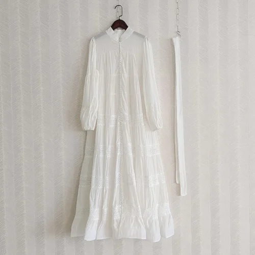 Product Name: Autumn Loose Casual Dress for Women Simple Style With Stand Collar Long Lantern Sleeve Lace Waist Single-Breasted Leisure