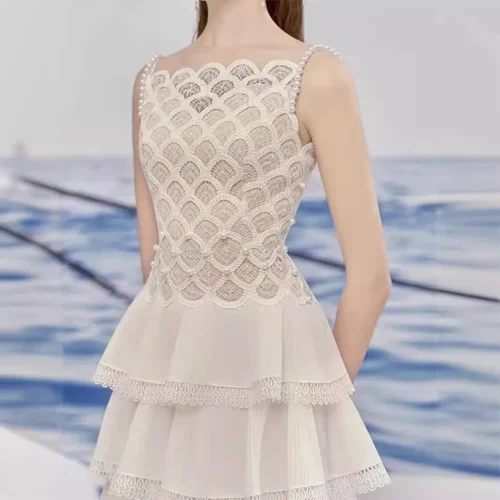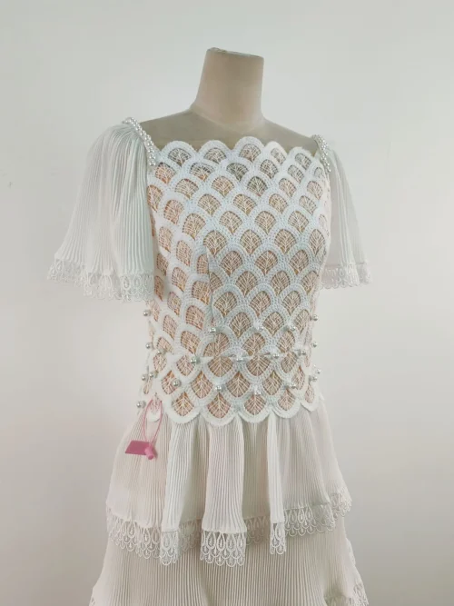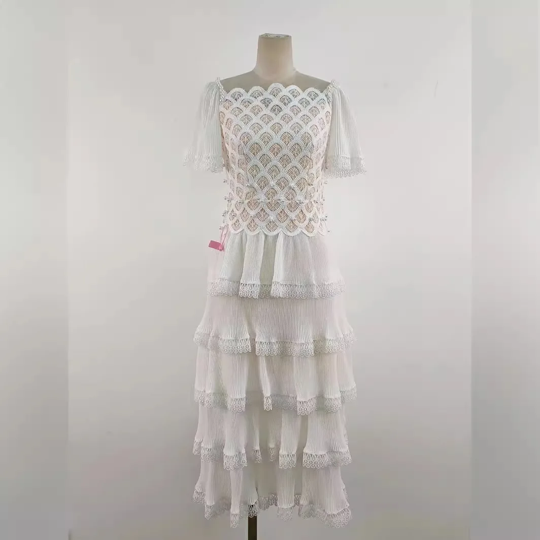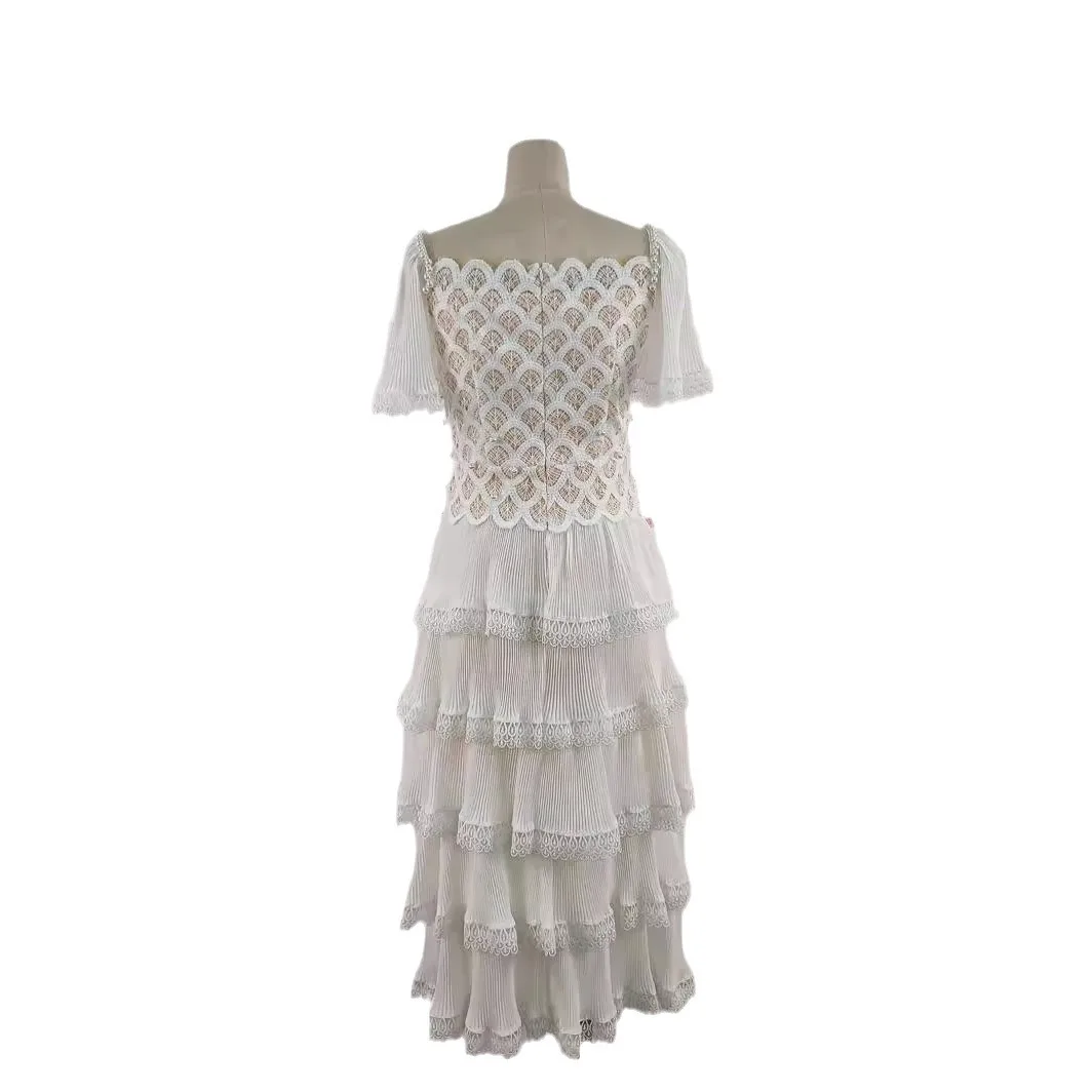 Bettergirl Vietnam Design Small Wave Splicing White Cake Dress Heavy Lace Waist Midlength Dress