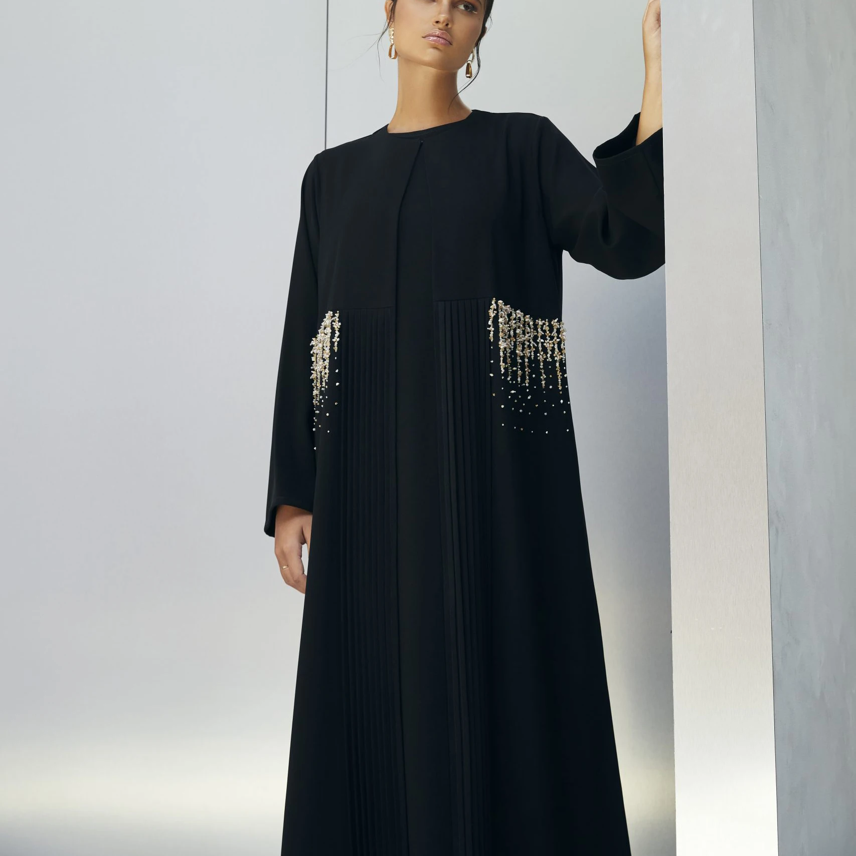 Product Name: Black Islamic Muslim Eid Arab Wear Round Neck Beaded Plisse Abaya Maxi Dress for Casual Women Clothing Abaya Dubai Adults 0.58kg