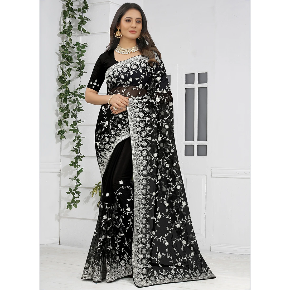 Black Resham Work Net Saree Modest Wedding Dress with Elegant Net Overlay