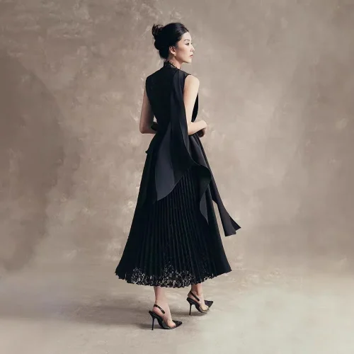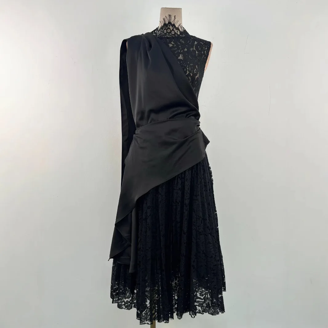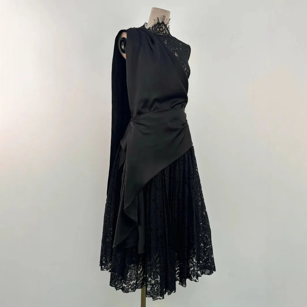 Boutique 2025 High Quality Elegant Black Slim Women Dress round Neck Lace Pleated Patchwork Long Evening Dress