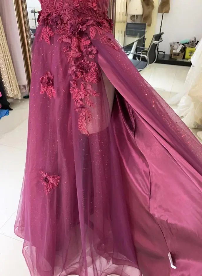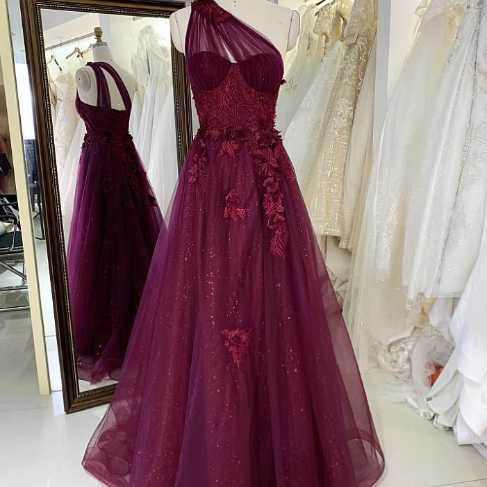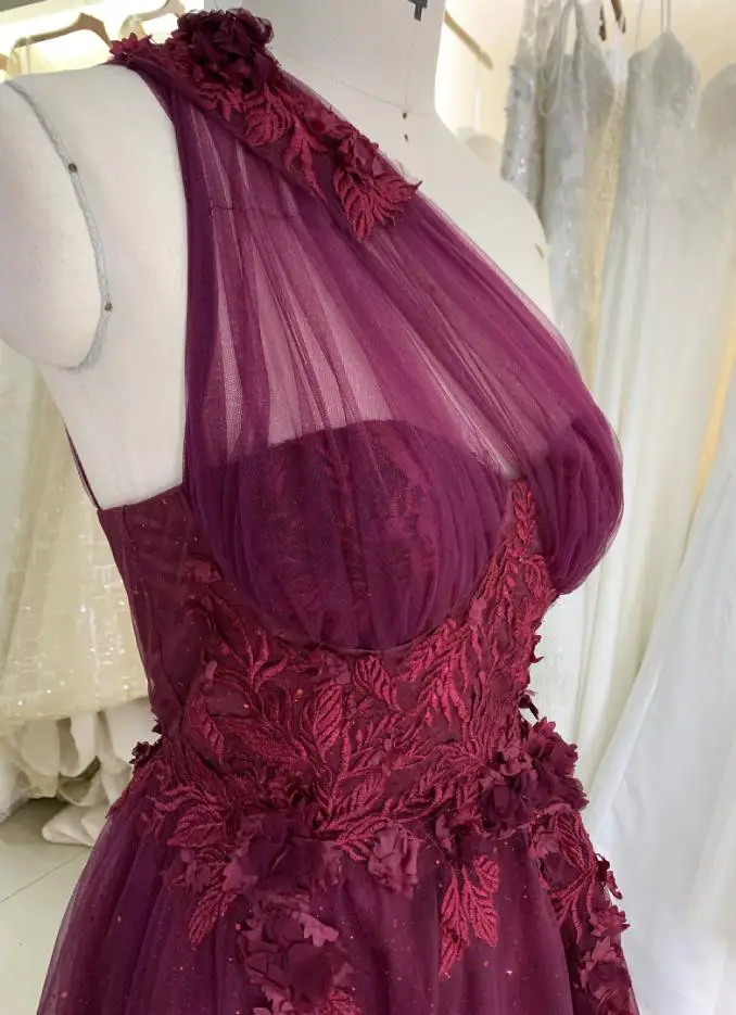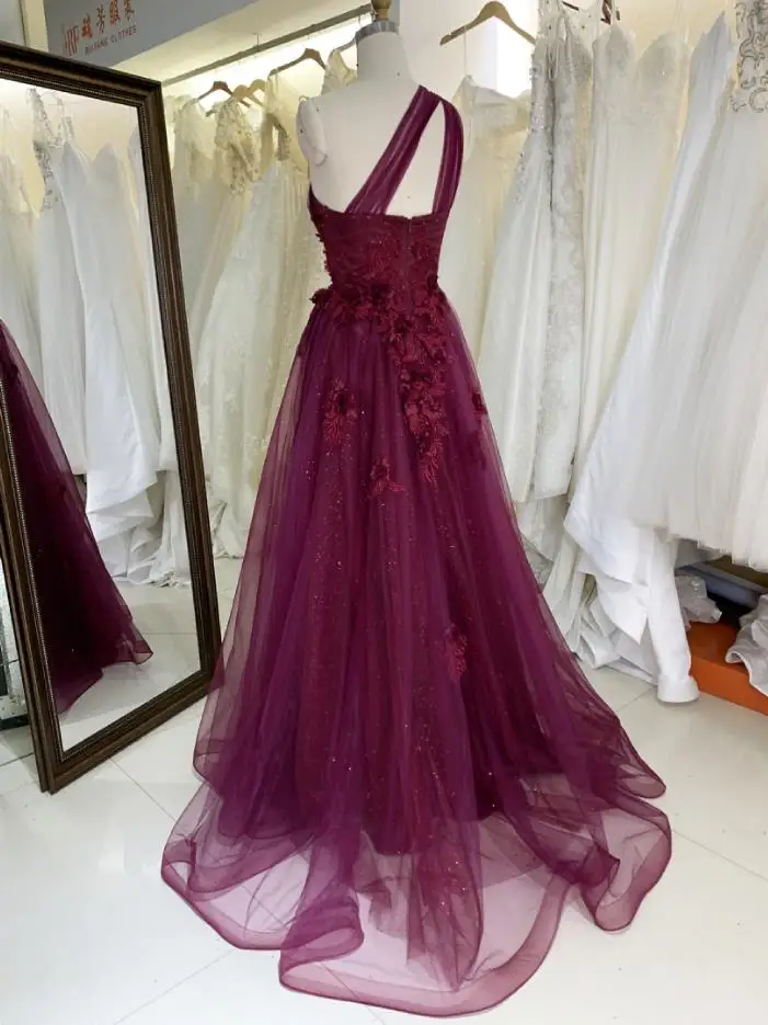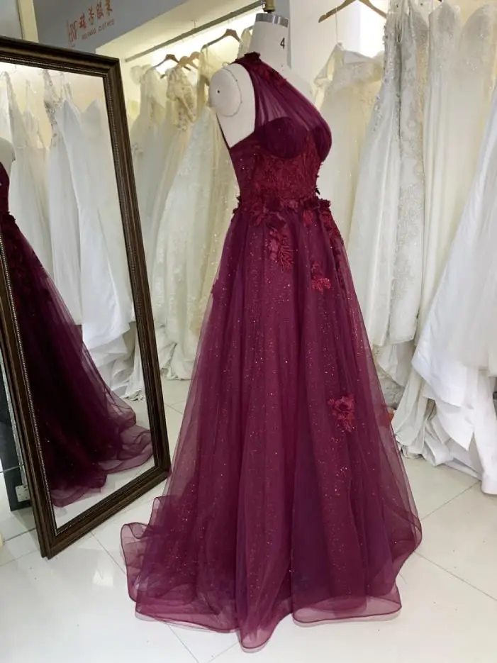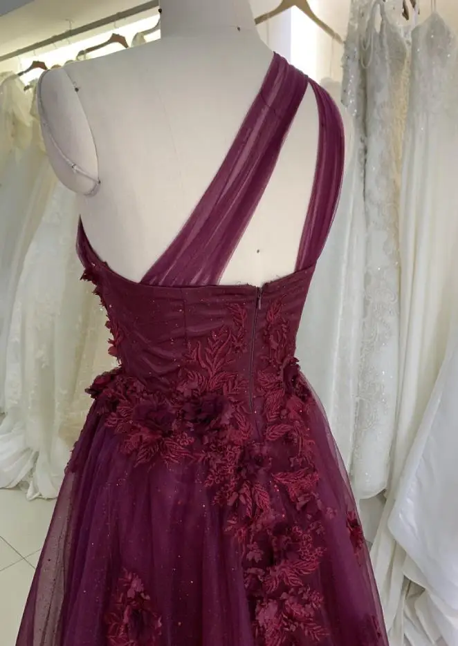 Burgundy Black New 3D Embroidery Sleeveless One Shoulder a Line Tulle Prom Dresses