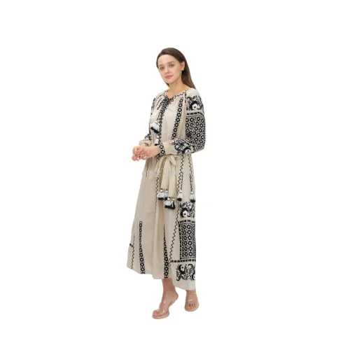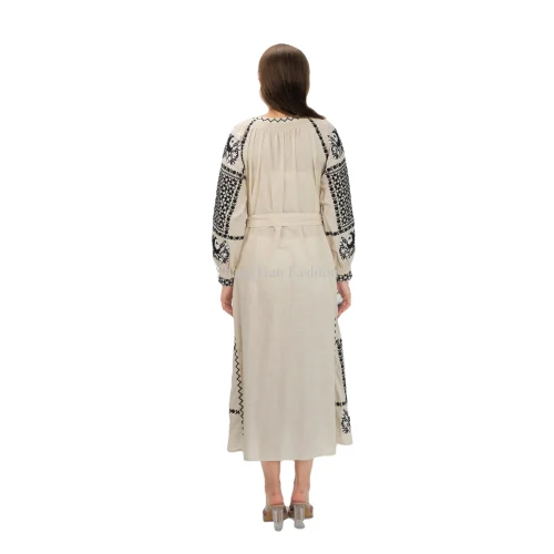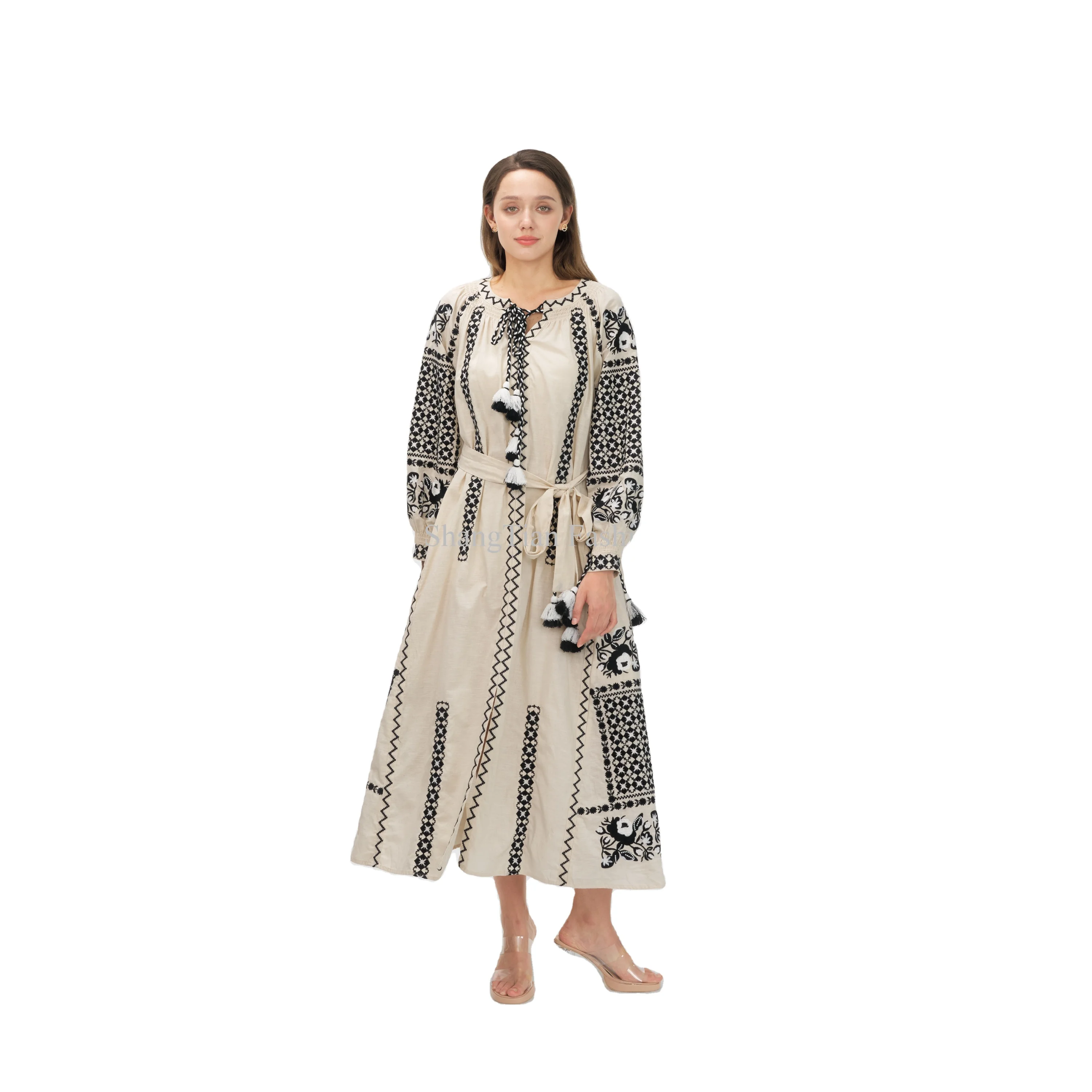 Casual Floral Embroidered Linen Dress for Women New Fashion Long Dress with Natural Waistline 100% Washable Linen