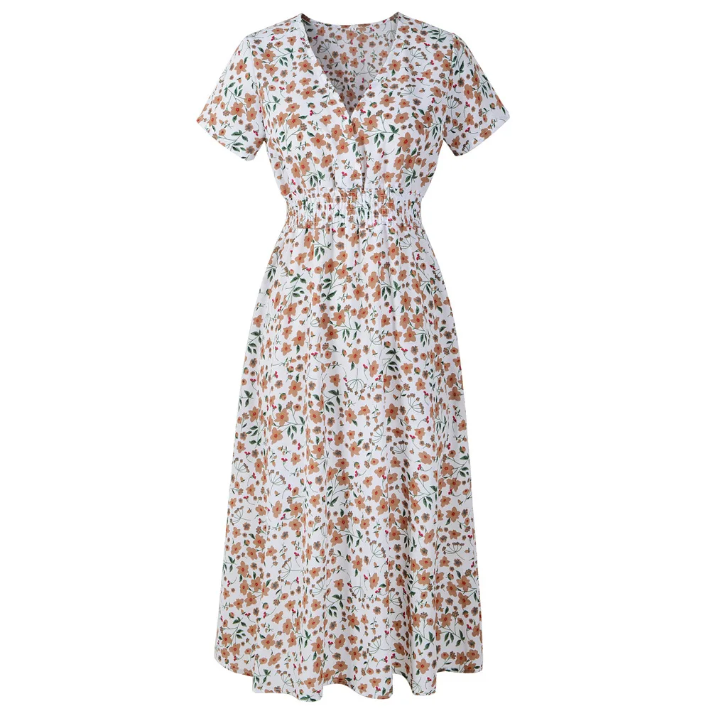 Product Name: CBC286-Floral Dresses 2022 Women Slim Waist Short Sleeve Summer Casual Dress v Neck Korean Dress Floral Print