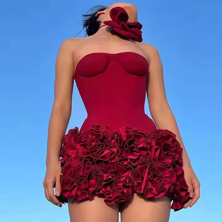 Product Name: Celebrity Party Cocktail Dress Strapless Backless Red Structured Floral Embellished Mini Length Bodycon Christmas Dress