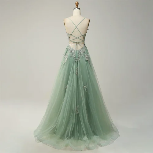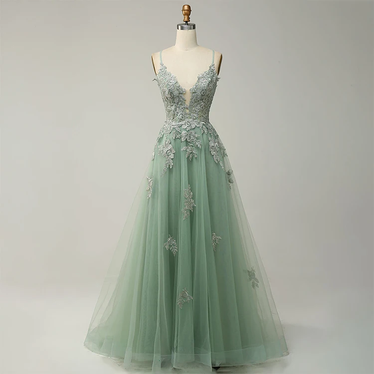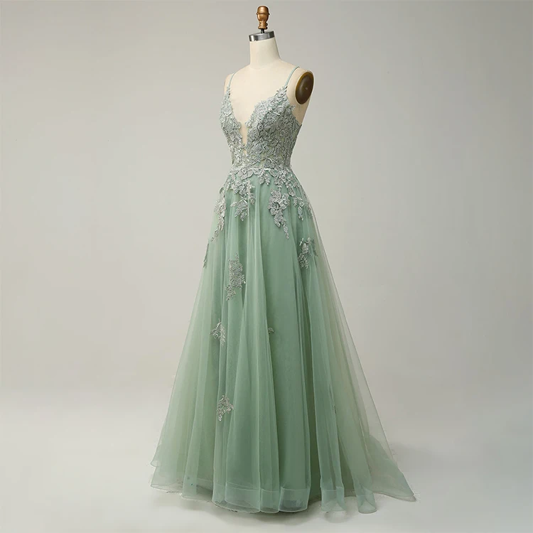 Product Name: Colorful a Line Spaghetti Straps Beading Appliques Long Tulle Women Evening Dresses Prom Dress With Cross Back