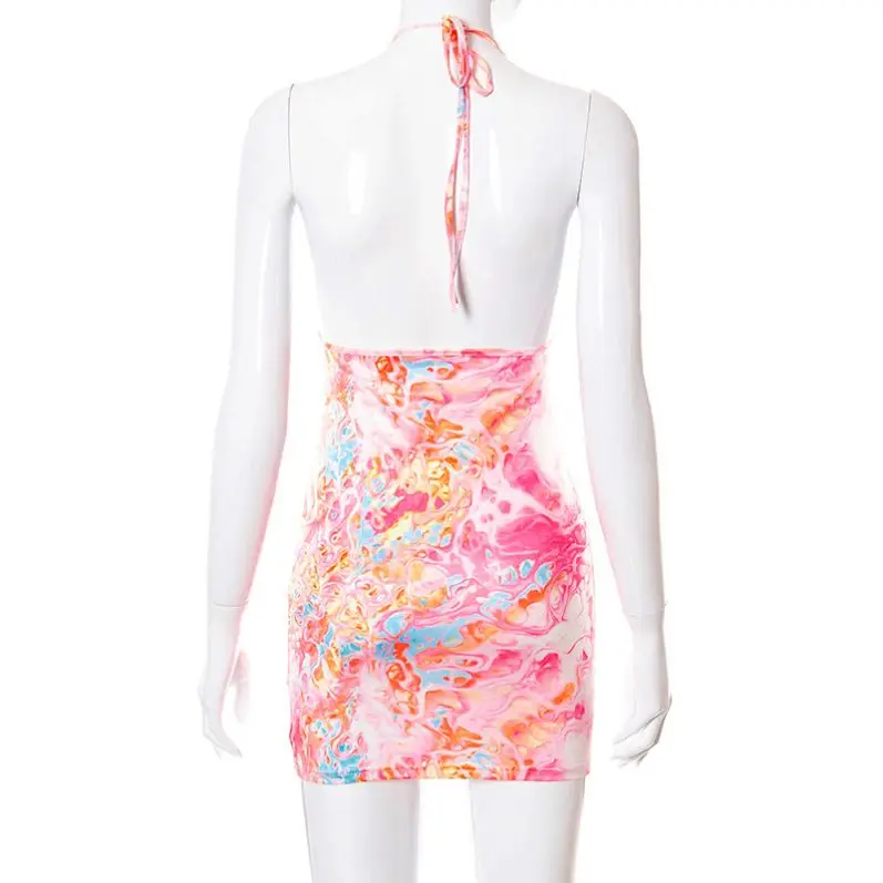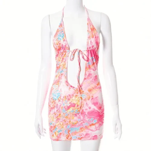 Product Name: Deep V Neck Printed Flower Color Halter Sexy Mini for Women’s Dress Backless Beach Sundress Lace up