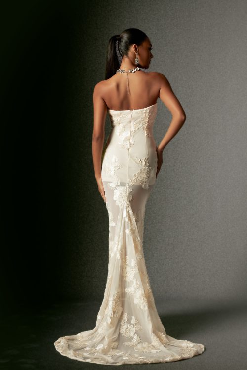 Deliyn Strapless Embroidery Flower Mesh Maxi Dress