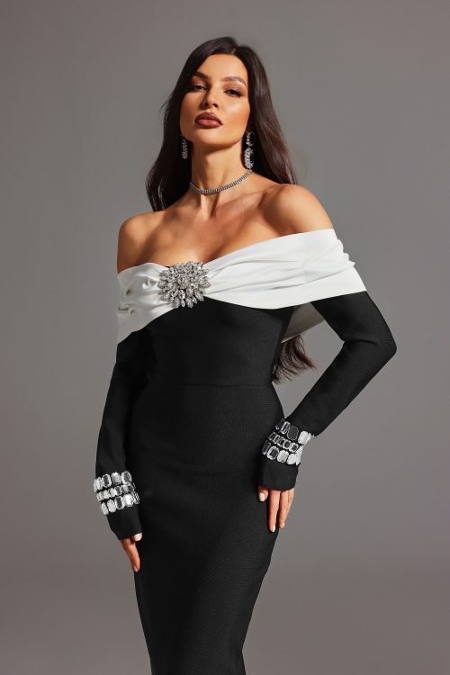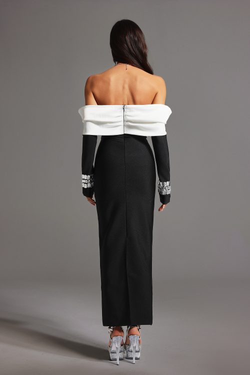 Derlyn Straight Shoulder Long Sleeve Diamond Bandage Maxi Dress
