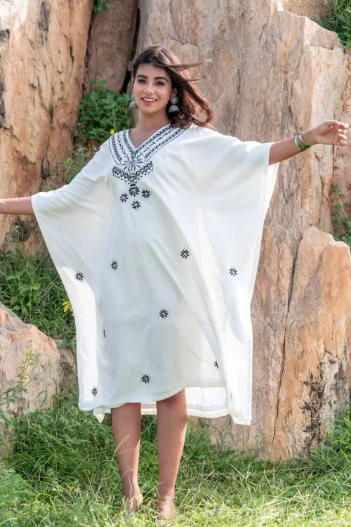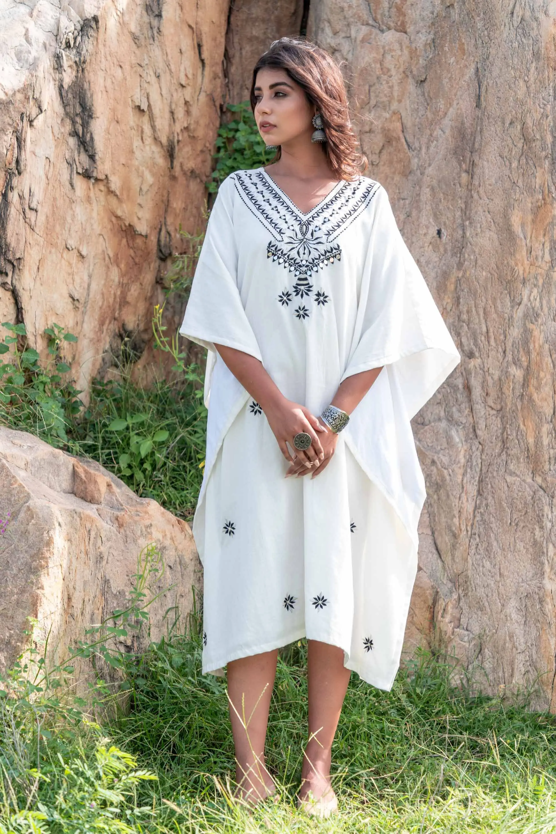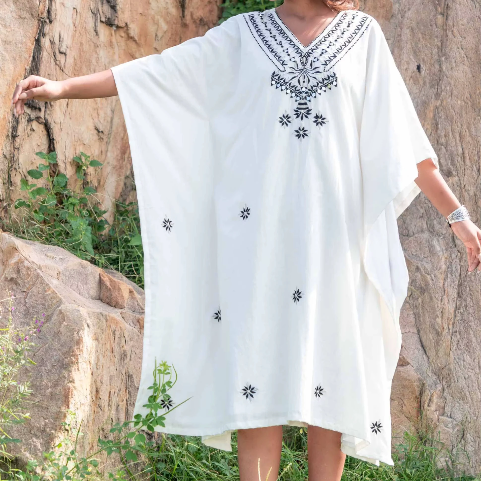Product Name: Designer High Fashion Women’s Bohemian Elegant Maxi Dress V-Neck Three Quarter Sleeve with Ruffle Linen Cotton Fabric Washable