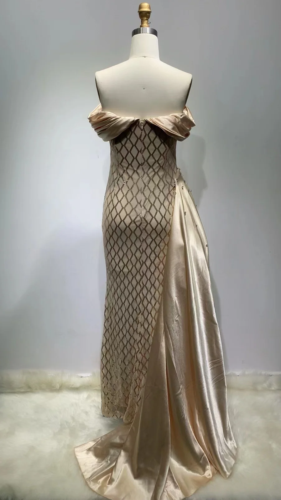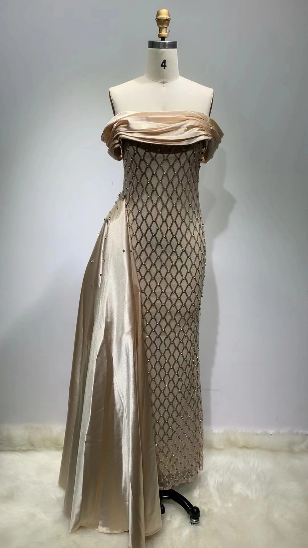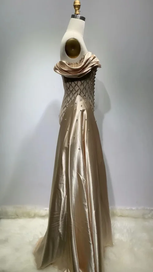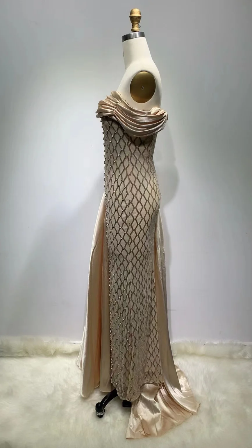 ED2311 Kimshein Beading Ruffled Off the Shoulder Sleeveless Mesh Fabric Satin Evening Formal Prom Dress for Women