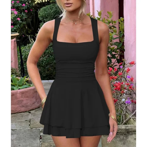 Product Name: Elegant A-Line Women’s Summer Mini Dress Square Neck Sleeveless Beach Party Short Dress Front Natural Plain Dyed Casual Dress