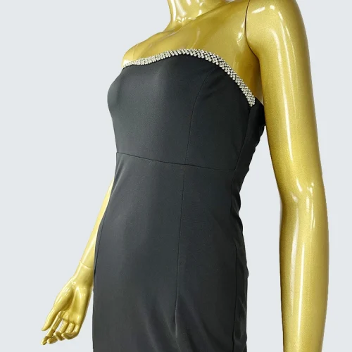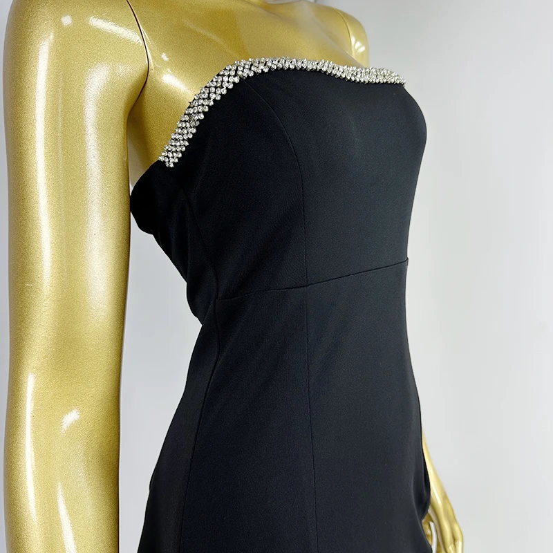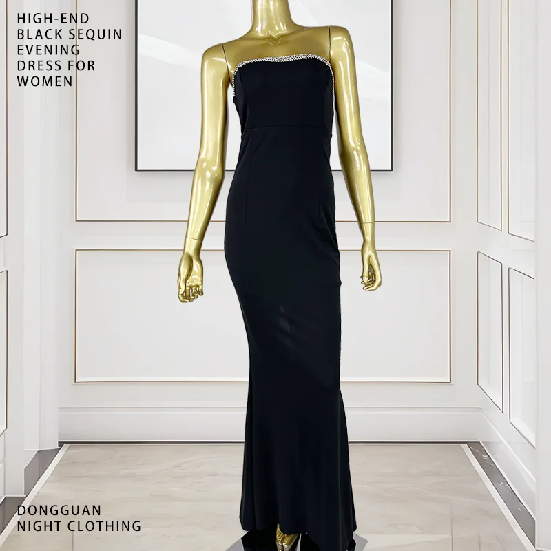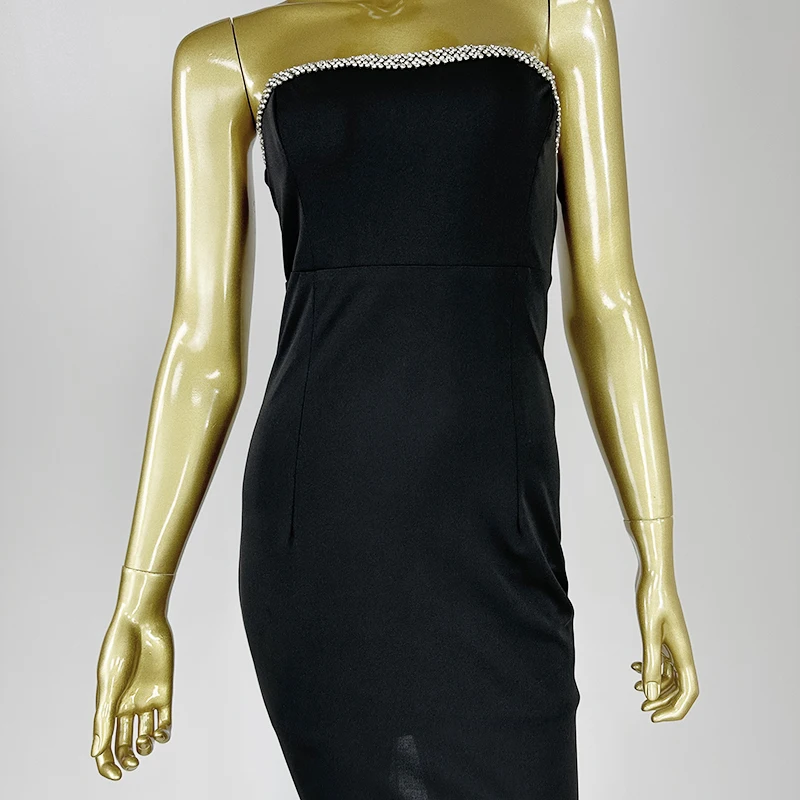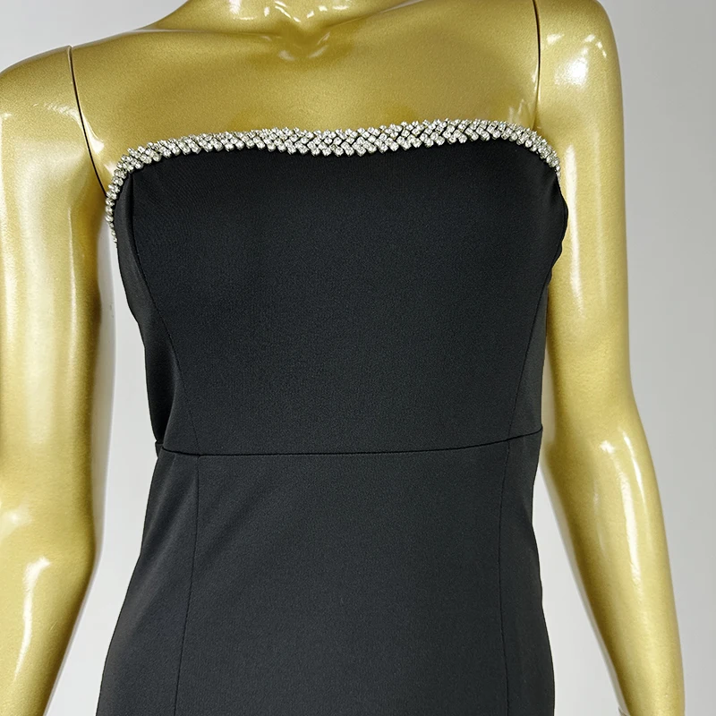 Product Name: Elegant black strapless with rhinestone chain high waisted form fitting mermaid design and a back slit evening dress