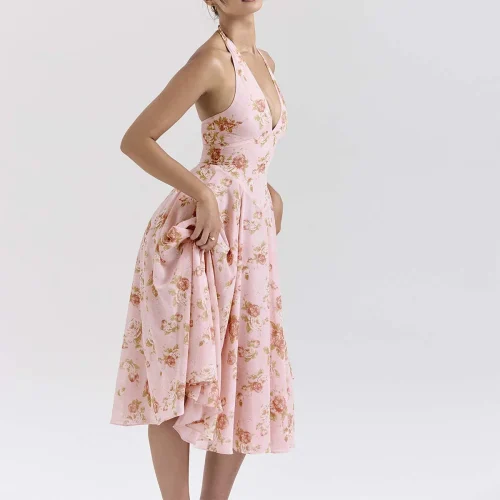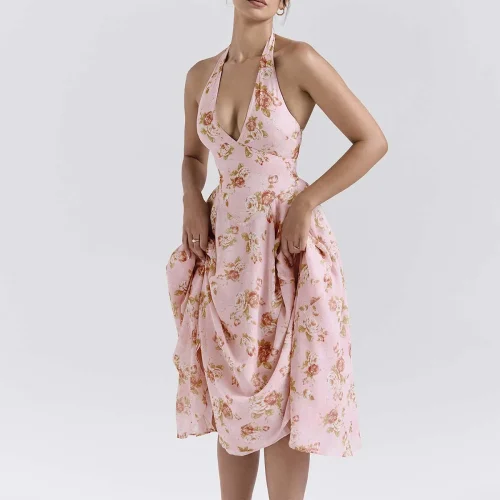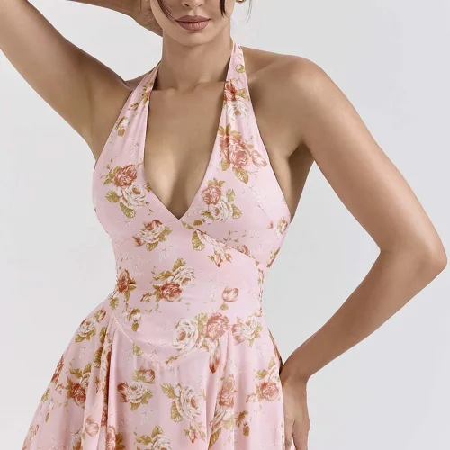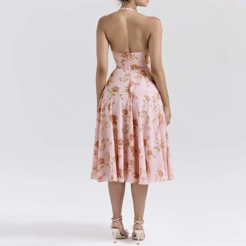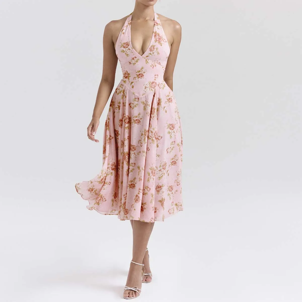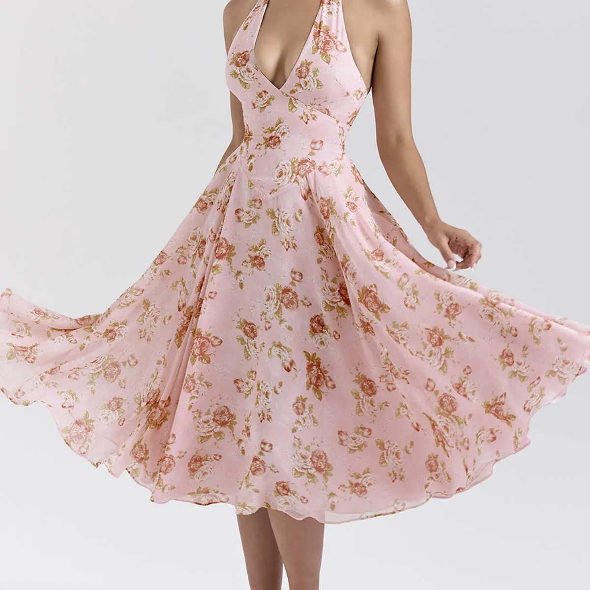 Product Name: Elegant English Vintage Rose Print Georgette Halter Sundress Ideal for Summer Women Clothing