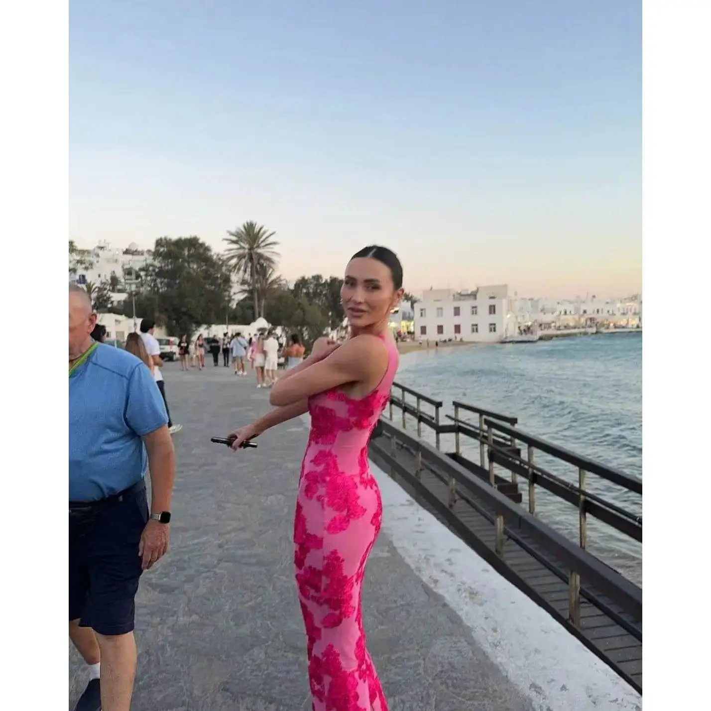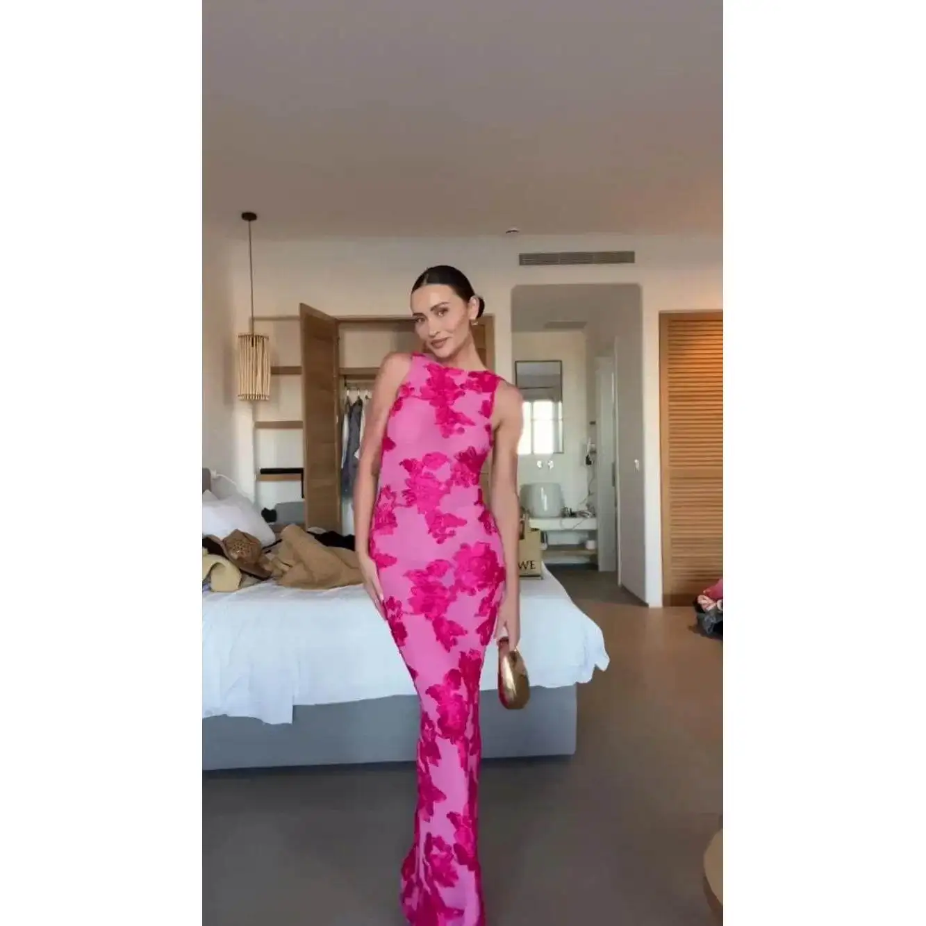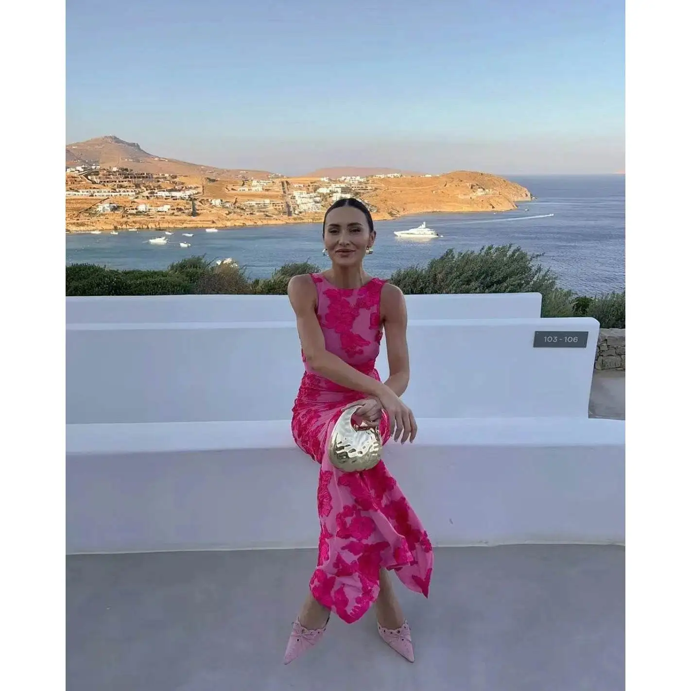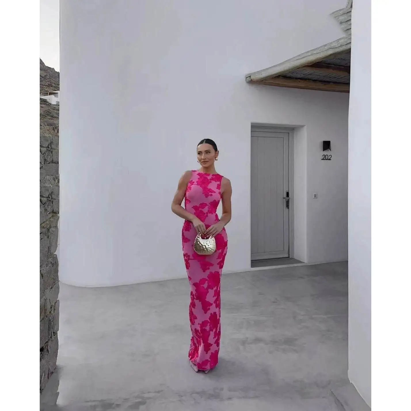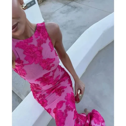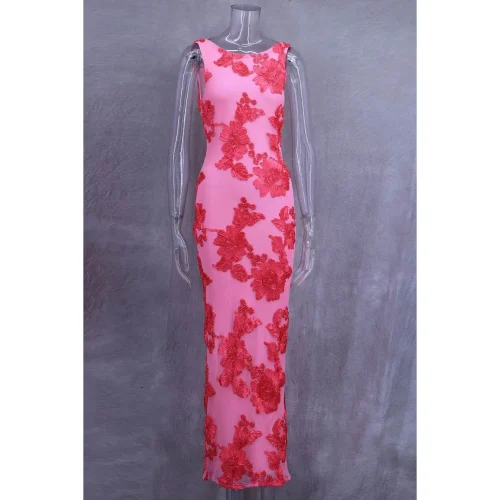 Elegant Pink Flower Embroidery Evening Dress for Women Sexy Sleeveless Backless Design Luxury Curvy Robe for Holiday Vacation