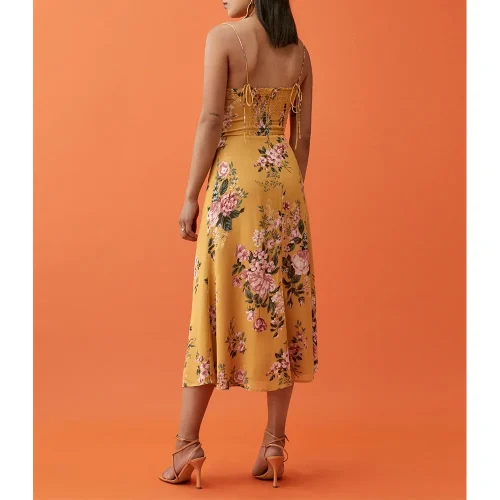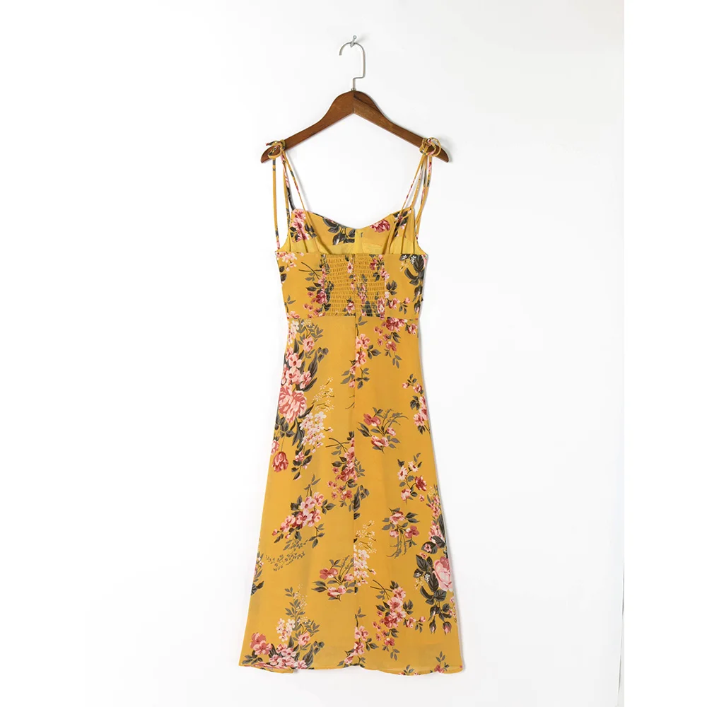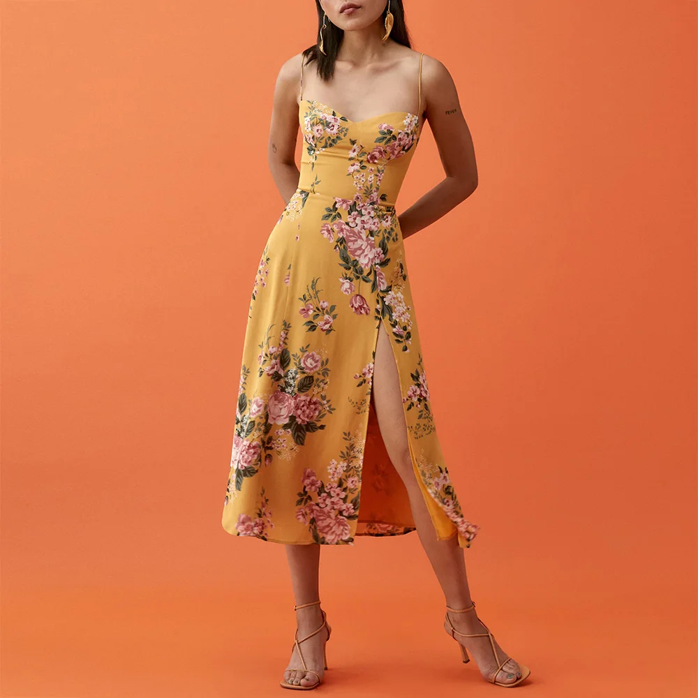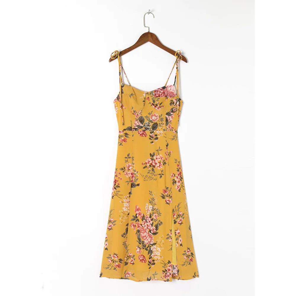 Elegant Vintage Floral Midi Dress for Women Summer Sundress with High Slit Spaghetti Strap Chiffon Casual Sexy Side Woven Weave